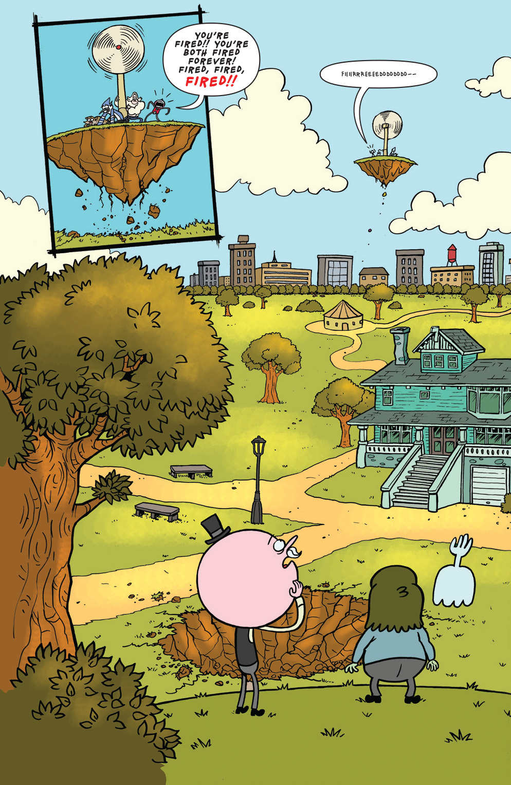 New story arc, and introducing new main series artist Laura Howell! Benson gets wind turbines for the park to save energy, but when Mordecai and Rigby turn them up super fast to cut corners they send the park into the clouds!