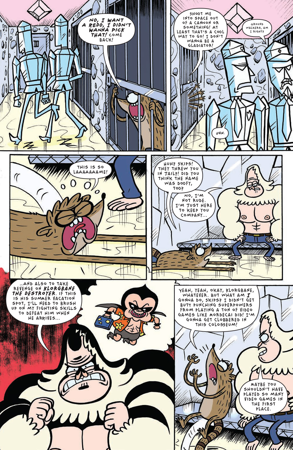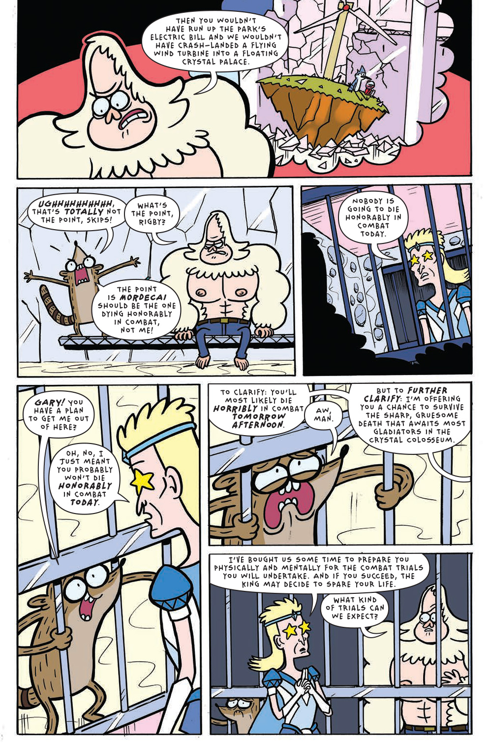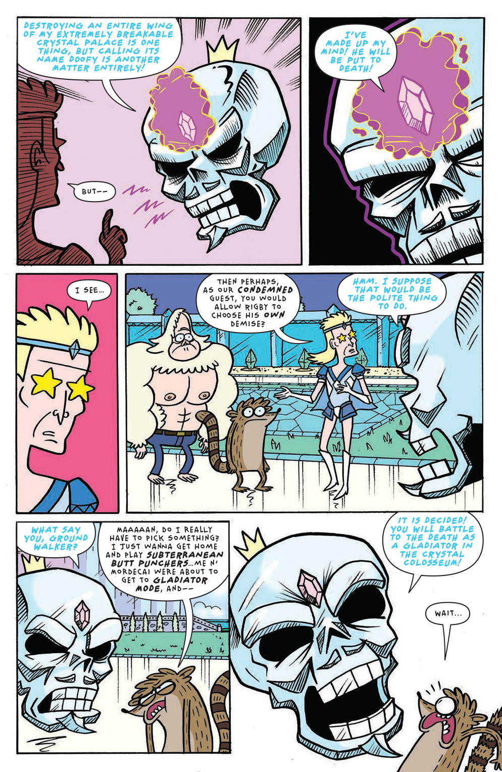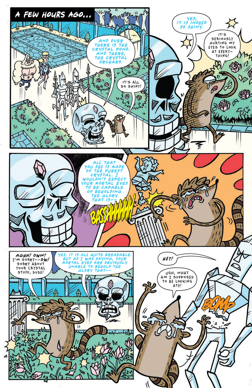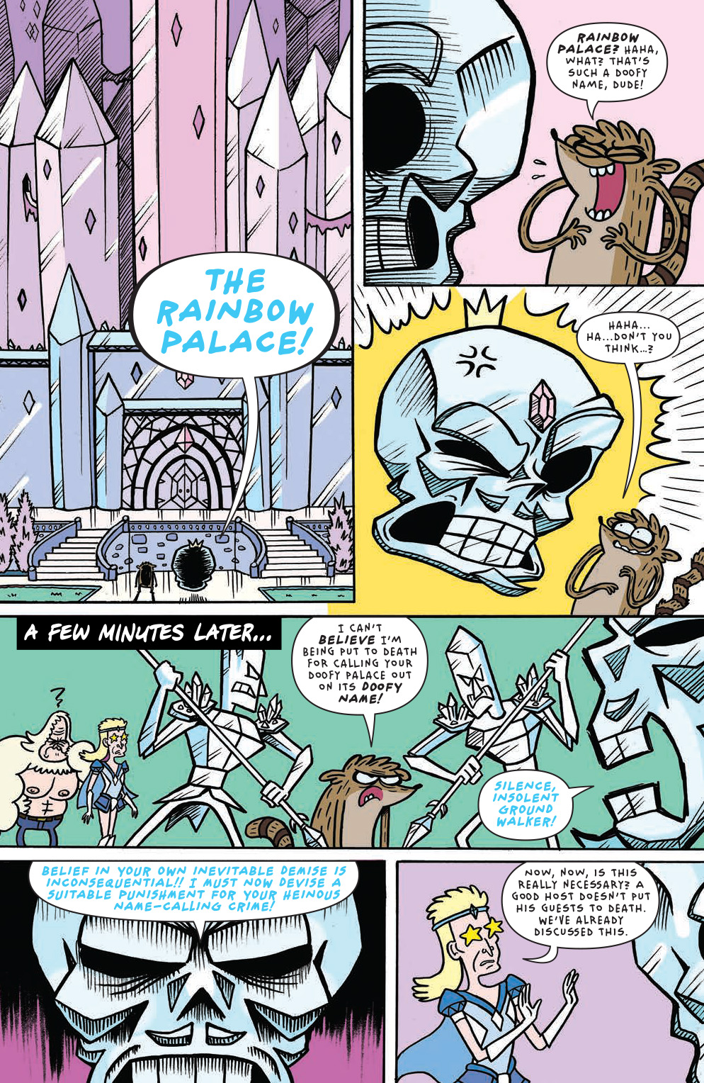 Mordecai, Rigby, Benson, and Skips take a tour of the Rainbow Palace in the clouds, but it turns into a battlefield!
