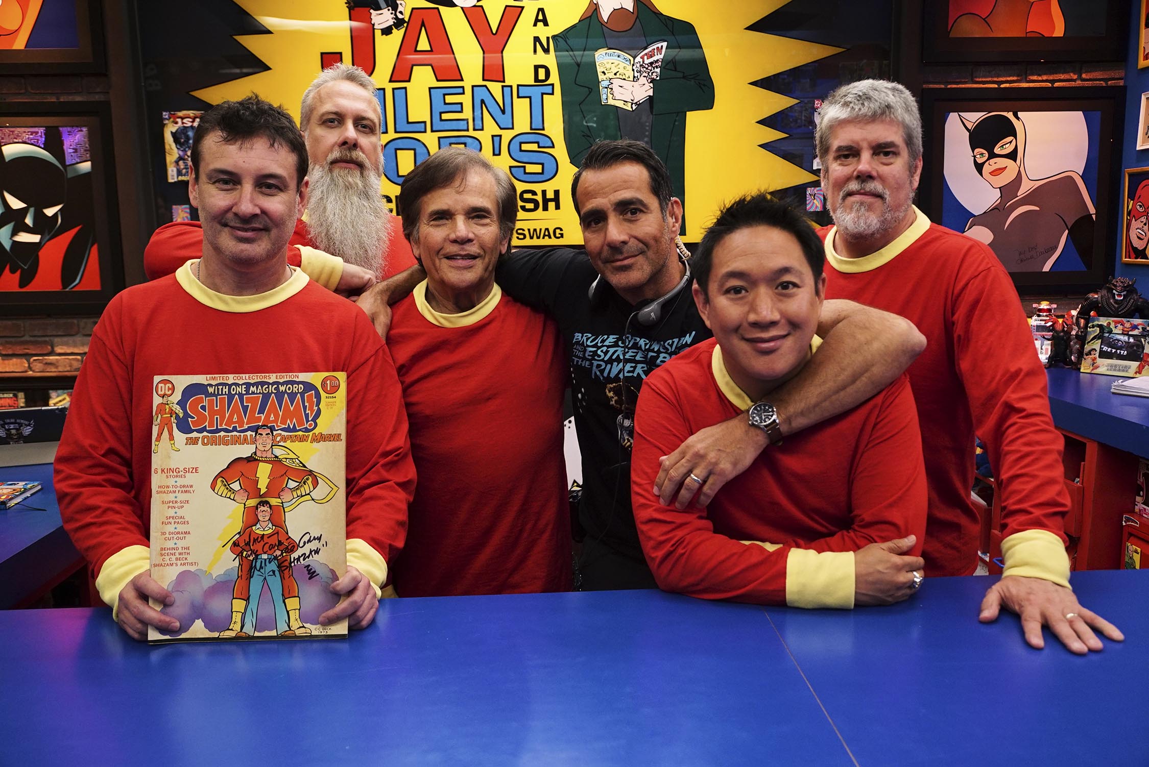 To welcome Michael Gray into the store, Bryan, Mike and Walt don iconic Billy Batson t-shirts. The look catches Michael off guard and embarrasses Ming. The popularity of the show and the lasting impression it had on the public is discussed and then the gang begins to wonder why Captain Marvel never achieved the heights of other superheroes like Superman. Walt reasons that the character never had a great rogues gallery and Kevin brings up the inchworm, Mr. Mind. Michael recounts what it was like to be a teen idol and the visit wraps up with a photograph featuring everyone in a red and yellow Billy Batson t-shirt.