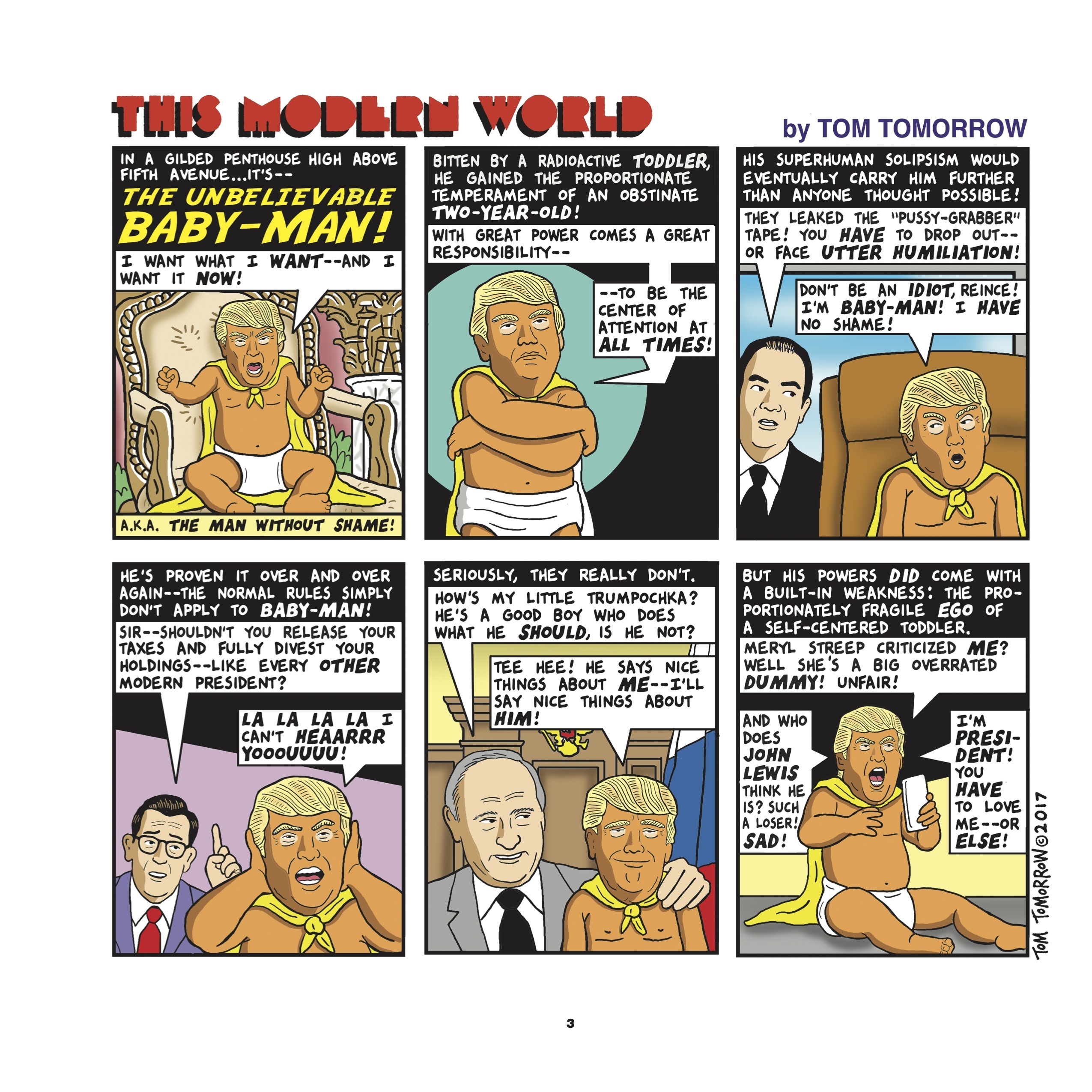 Tomorrow’s brand of satire is particularly effective when he gives Trump semi alter egos including ones based on a hard-boiled private eye and two of Marvel Comics’ most iconic heroes. Reasoning that Trump’s inability to feel shame is the result of being bitten by a radioactive toddler provides fodder for comic book fans and is laugh out loud funny at times.