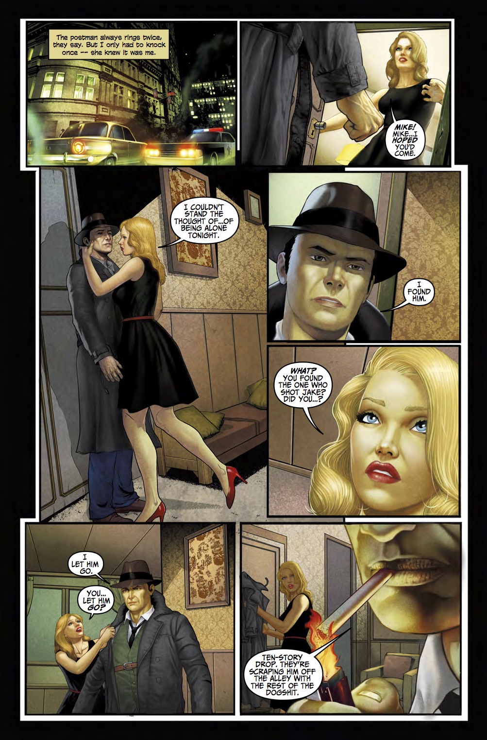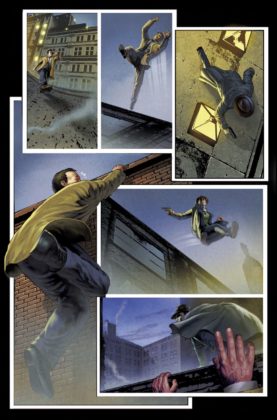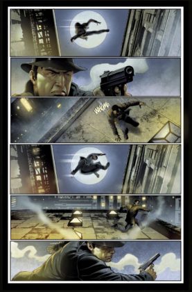 The art and colouring (Marcelo Salaza and Marcio Freire respectively) are what you would expect from a pulp detective story; a certain grittiness, Dutch angles, rain, and lots of shadows and darkness that eschew the glossy look of many a comic. It’s as if you are watching events unfold through the thick plume of cigarette smoke, and there’s enough here to make Don Draper envious, or at the very least be convinced the comic was sponsored by Camel, Marlboro, or Chesterfield.