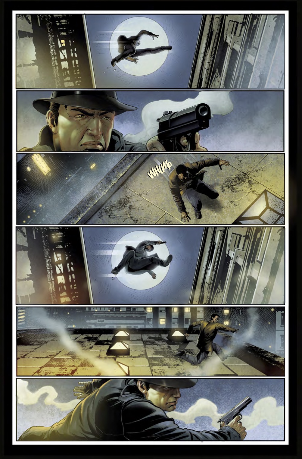 The story is told in first person, and we ride alongside Hammer as he chases down criminals and introduces them to his .45 automatic. A far as the violence is concerned, the comic doesn’t pull punches; people get shot, dropped from rooftops and burned alive. Note I said people; women aren’t immune from the violence that inhabits Hammer’s world.