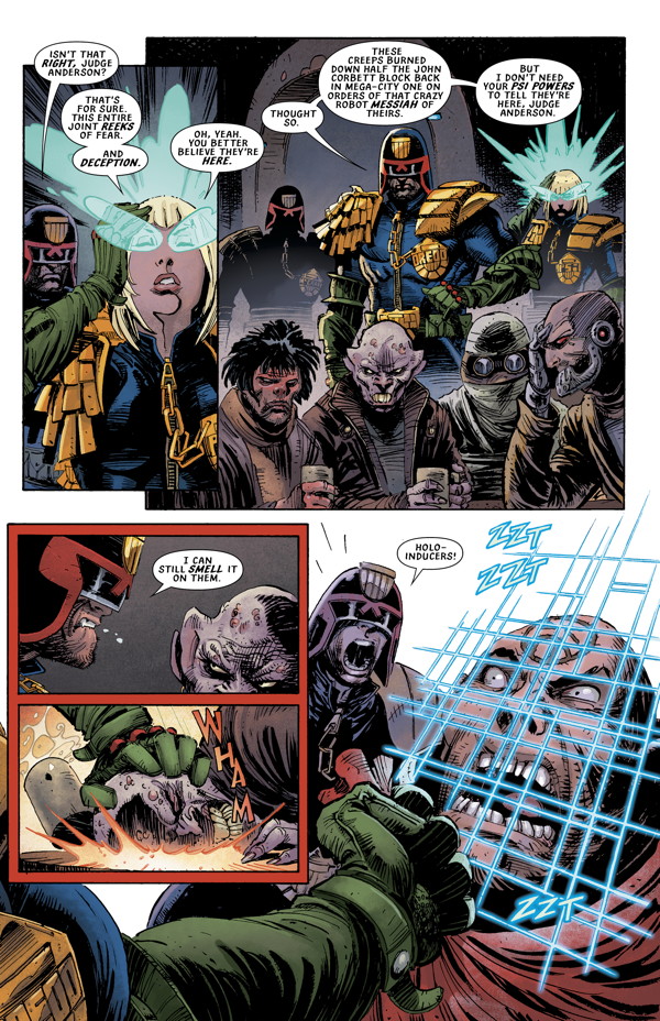 With that said, Layman does an exceptional job in recreating these iconic characters into a comic book – specifically, Judge Dredd. He is able to accurately depict the dialogue, attitude, code and strategy of the Judge Dredd that fans are familiar with. As the only character out of the three that can speak English, it’s fitting that the story begins with Judge Dredd. His duty, as a judge, is to uphold the law and serve justice, bringing him and his colleagues in a vast atomic wasteland known as the Cursed Earth. From there, he follows a lead to track down the psychotic-robo messiah, Archbishop Emoji, who ends up disappearing into the wildland jungles, Alabama Morass. And, of course, the relentless Judge Dredd makes the decision to go into the unnatural forest and hunt down Archbishop Emoji.
