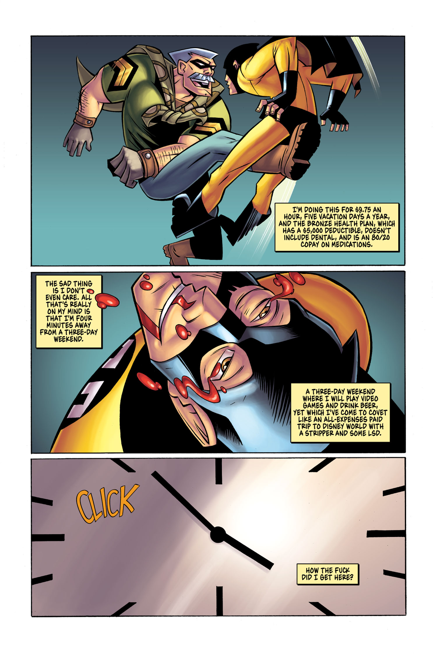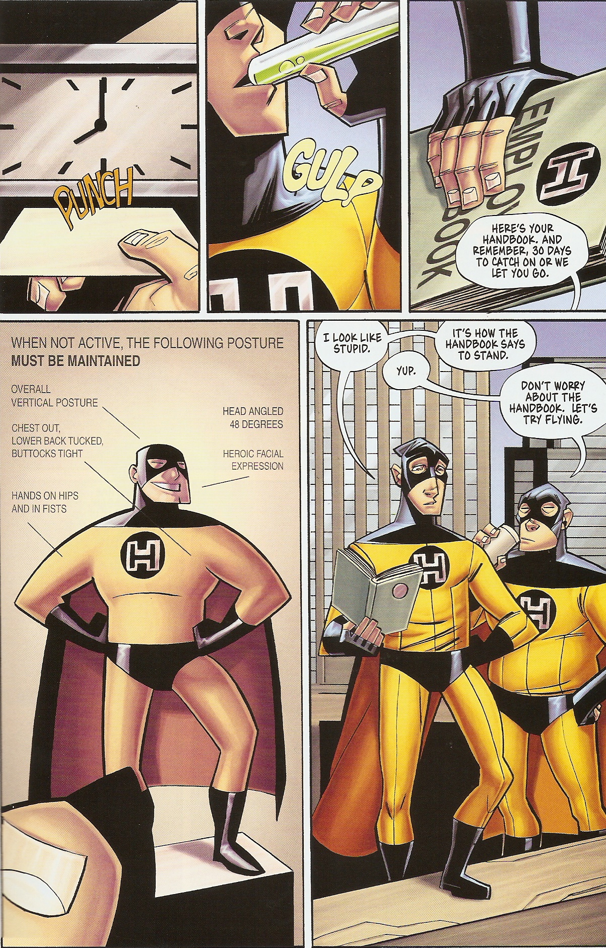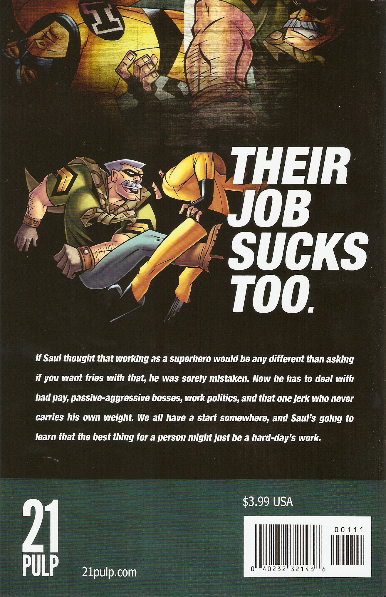 The satirical slant touches upon the difficulties of living in the land of opportunity in 2015. No one is safe from downsizing. No one!! You may be a rookie or a seasoned veteran. Cuts will be made where the big wigs deem them necessary. The outrageousness of super-heroics is emphasized in this title. Seriously: a handbook for how to pose, fly, and speak?? Pshaw!