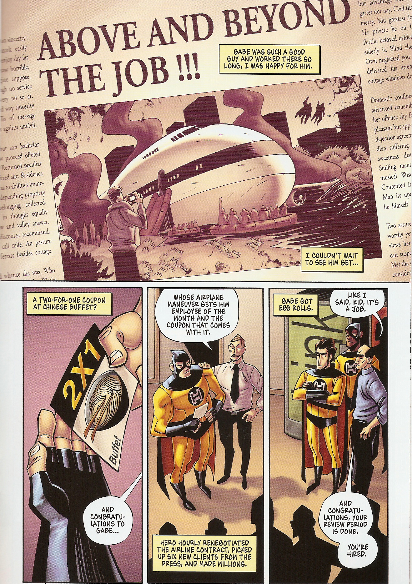 Saul’s hesitation prevents him from foiling a bank robbery. Deflecting bullets becomes standard fare. A falling flaming plane proves difficult in landing until Gabe takes over. His heroics are hailed in the media. His ultimate reward? A two-for-one coupon at a Chinese buffet restaurant. On a happier note, Saul is officially hired.