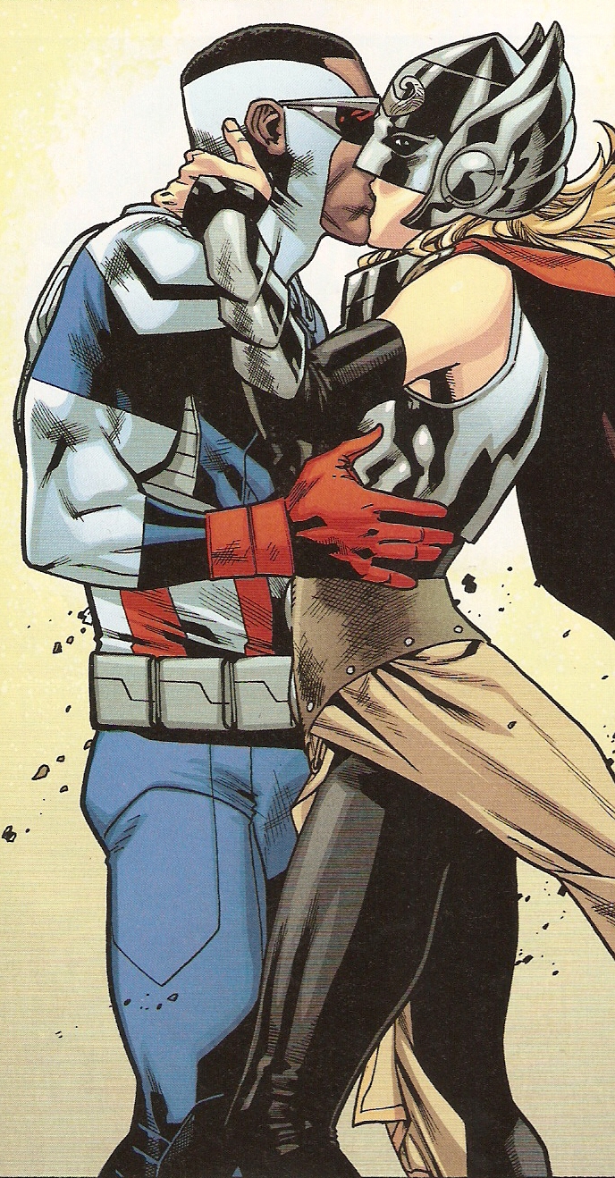 After the three-course meal comes dessert with a big red cherry on top!! After the skirmish (and needless destruction), The Goddess of Thunder plants a big one on the Sentinel of Liberty :0 All signs point to…say what??? She simply wanted to do it. Rightly so! The chuckles came out with her post-smooch prognosis. Sam Wilson feels that he has to return the compliment. Thor chocks it up to the Asgardian version of YOLO.