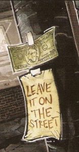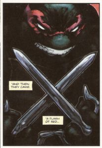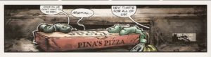 Tom Napolitano sharpens his pencil to perfection with the handwritten note from the hungry boys, the clearly-labelled pizza provider, and the indiscernible expletive from Raph’s mouth. I could scribble like that too ;-P He also goes for the throat with Croc’s growl, Mikey’s vow of vengeance, and the story’s title.