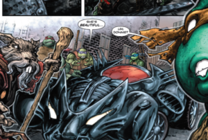 Trudging through the sewers, Killer Croc and two new hires are tracking the Batmobile. Croc assures his cronies that his hideous reptilian exterior houses an impressive intellect. He will follow Batman to Wayne R&D. The plan is to not engage with the Bat; it’s to carjack the Batmobile and sell it for parts. Even one small piece is a substantial amount in the black market. Croc and his henchmen come across the Heroes in a Half Shell’s HQ. Out of spite, he crushes one of their video games. The fab foursome are hiding in the ceiling. Mikey feels more crushed than his precious cartridge. Time for retribution!!
