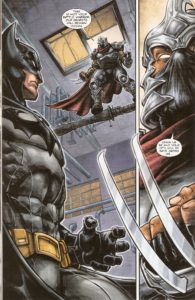 Right as rain, the Foot Clan strike. Batman emerges as the holograms of the personnel evaporate. Geez, Louise!! In the span of a three-page parallel scene, Bats has taken out the entire Clan but one lowly Foot Soldier. The newb begins to blab before a shuriken pierces his heart. The Dark Knight hears the mention of ‘Turtles’ before the mastermind makes his grand entrance. OOOHHH BBOOYY. Shredder versus Gotham’s Finest. This is going to be beyond epic. Fake-out!! The armor-plated antagonist opts for an abrupt exit. BOO! Batman mutters the phrase “Turtles…” I hear his gruff voice à la Marge Simpson’s disapproving tone.