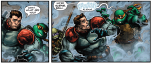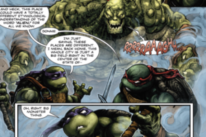 It’s green on green, excluding the humans. Mikey spooks one of the minions. Donnie pauses to become existential before Raph reminds him of the main threat. The four lunge at the ‘big monster thing’.