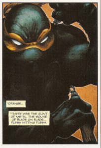 Ninjas of the Foot Clan raid a lab. Just as the security guards barge through the locked doors, a quartet of scary-looking masked ‘monsters’ with weapons drawn startle the narrator. This is ten times worse than the silent killers!! The scientist is shaken to her core. Another run-of-the-mill oddball attack in the Big Apple?? Nope!! Try Gotham City! WWHHOOAA :0