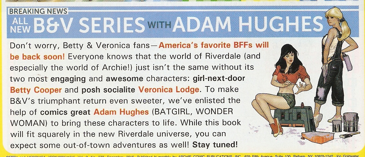 The announcement of the All-New B&V states that it will be in the summer. Surely, they cannot mean 2016?? That’s the only logical conclusion since we are currently in October. Interestingly enough, Betty pre-dates Veronica by four months. The bubbly blonde first appeared in PEP COMICS #22 [Dec. 1941]. The same issue that debuted Archie Andrews! The fiercely intense Ms. Lodge was brought in a ‘third wheel’ by PEP COMICS #26 [Apr. 1942]