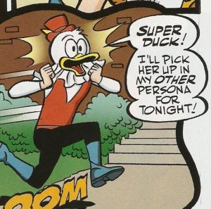 A comedy of errors ensues with Archie struggling to keep the ladies separate as well as his costumed identities. Things hit a major snag for Mr. Andrews when he tries to remove the Cosmo mask, revealing the Super-Duck one as well. The blonde-haired beauty and the raven-tressed ravisher pretend to be upset and ready to duke it out. Archie tries to prevent this fake fight and trips face first into the punch bowl. The girls come clean but Archie is miffed.