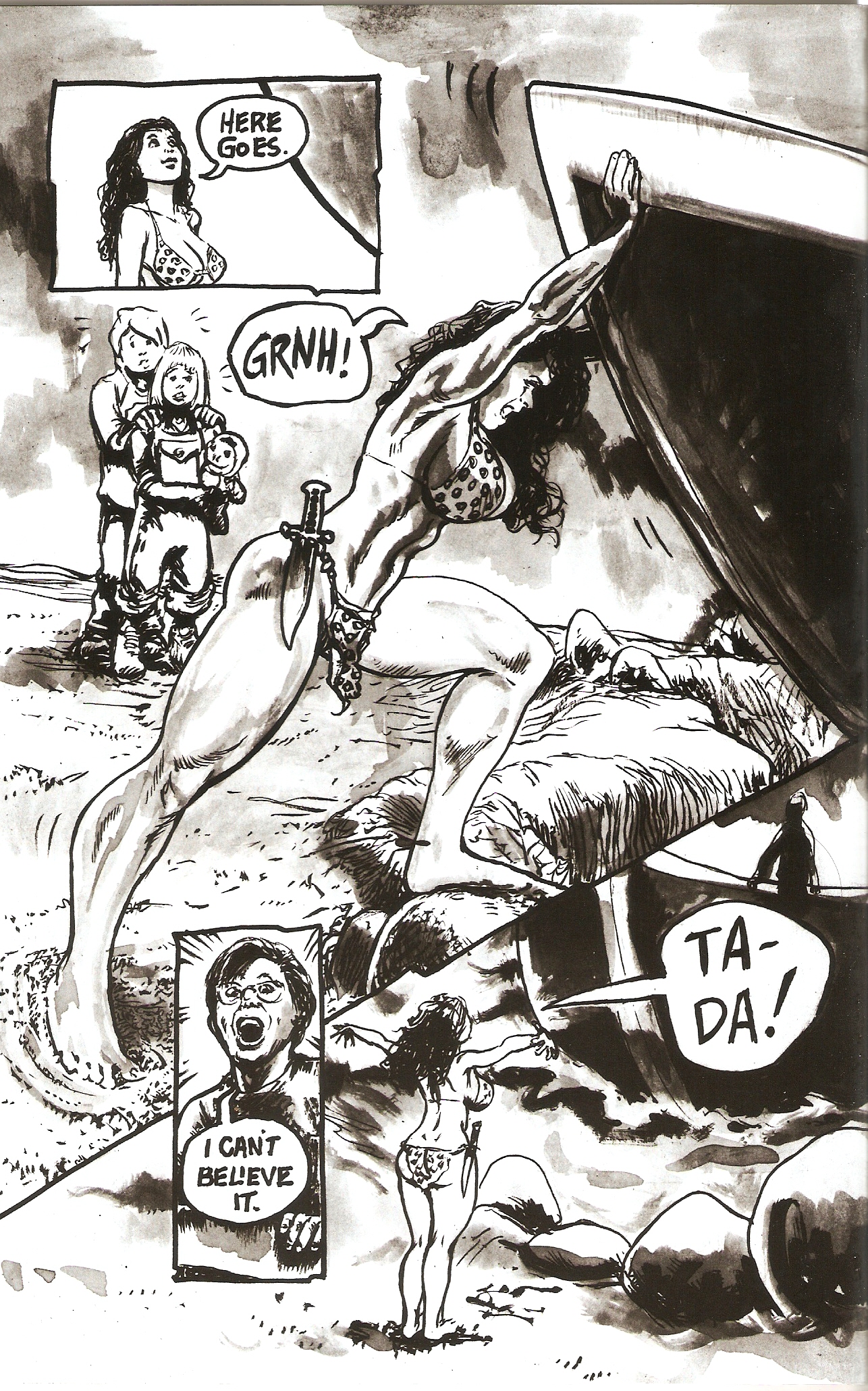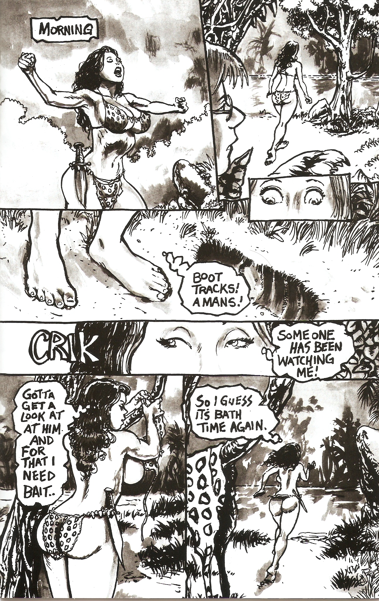 I dare say that Miss Meriem Cooper has plenty of T&A (tenacity and audacity). Copyrighted! No one can use that!! The plot and dialogue are simple and straightforward. This story is read in a matter of minutes. However, there are enough juicy tidbits to cock the eyebrows and gleefully grin. Mr. Massey’s thick lines and heavy shading reinforce the primal world inhabited by the eponymous protagonist. Meriem’s curvaceous features are thrust upon the reader to emphasize their importance. NNNAAAHHH!! Meriem has naïveté but is an all-around do-gooder. She is a force to be reckoned in regards to wrong-doings. Her sunshiny disposition is counter-balanced by her drive to foil villainy.