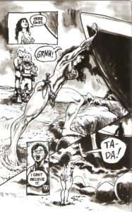 Cavewoman has been in print for twenty-two years!! I’ve seen the occasional book/mini/one-shot on the shelves and have noticed that the solicitations mention PI (please inquire) or AR (ask retailer) when it comes to ordering given its very adult content and/or exclusive covers. It’s all good considering that the character, the cast, the setting, the plot, and all other elements are played up for laughs. The outrageous situations she finds herself in cannot and should never be taken seriously even for fictional purposes. That being said, I keep testing the waters with an unbiased perspective. Speaking of waters, this one-shot is called CASTAWAY. Kwinkydink?!? Most definitely not!!