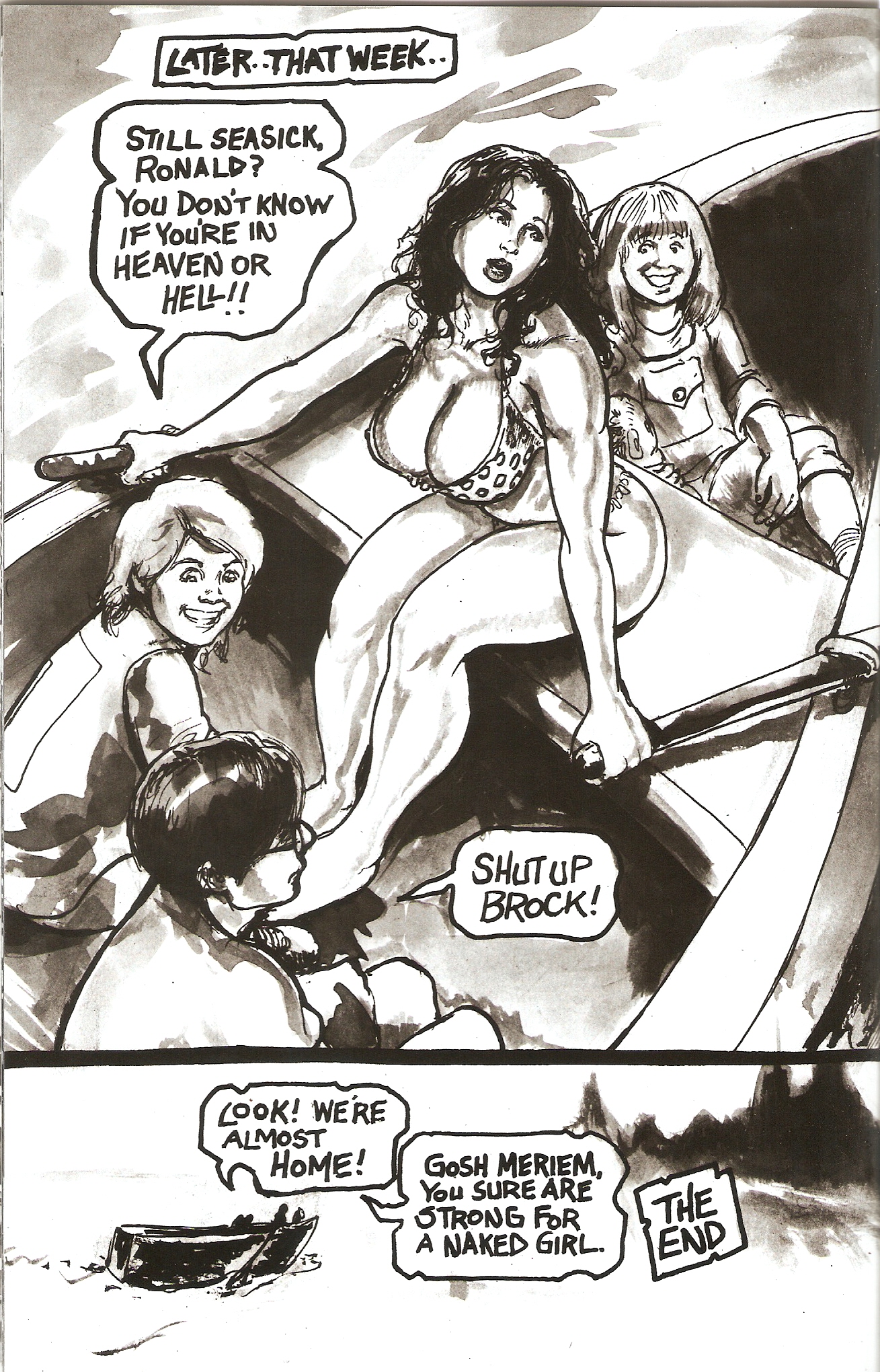 Meriem meets Brock and Kari. The little sister points out Cavewoman’s celebrity notoriety in the most casual way as children are wont to do. Meriem finds the boat and notices that it’s ship-shape. All it needs is a push which will occur the following morning. Cavewoman puts her back into it and presto! Ron is astounded. He focuses on Meriem’s backside as she walks away with his sibs to grab the supplies. Hormones are raging!