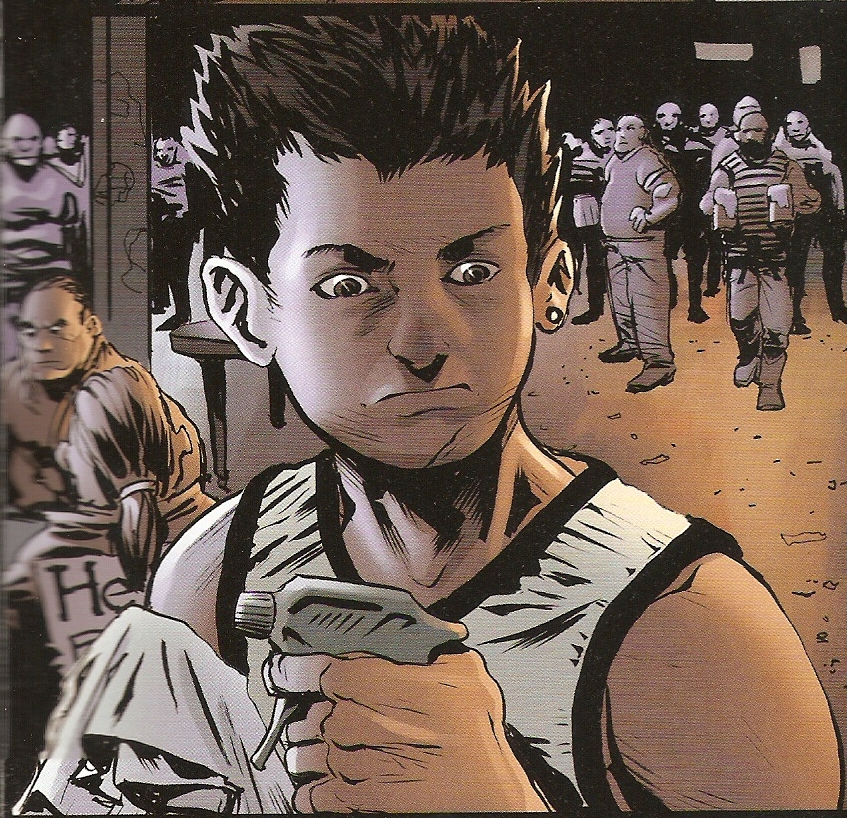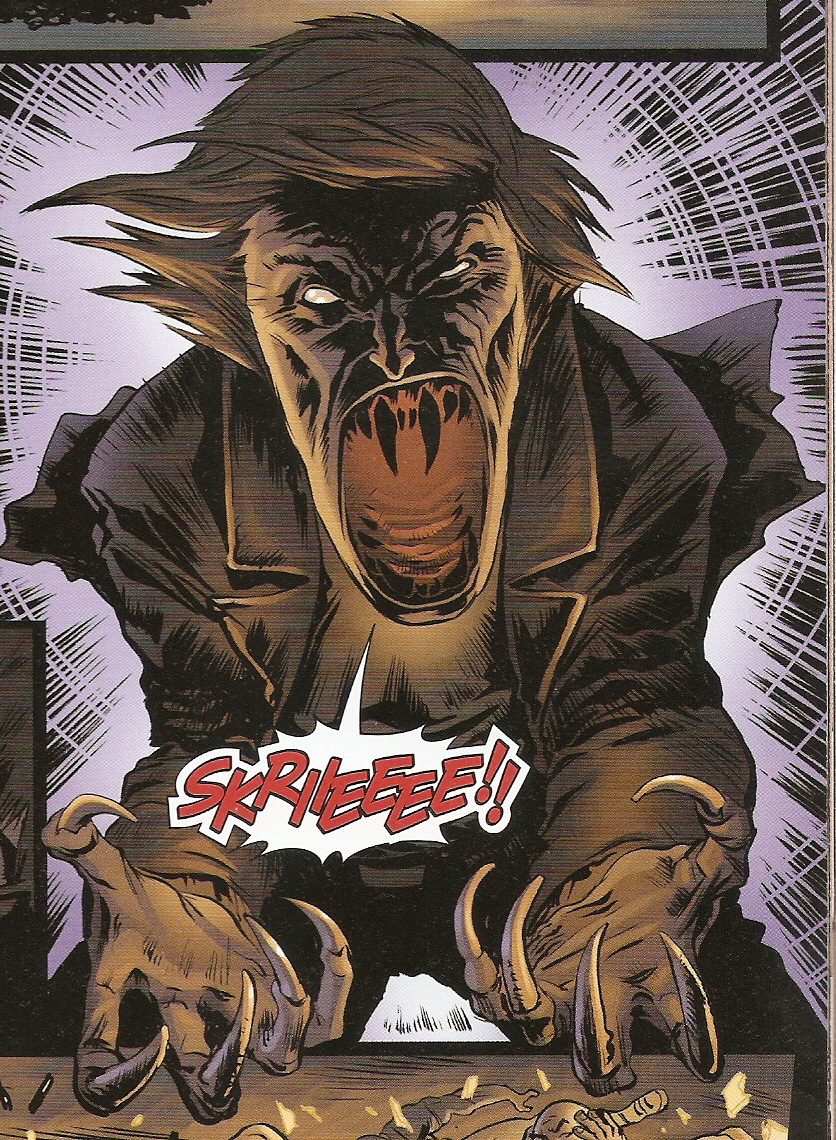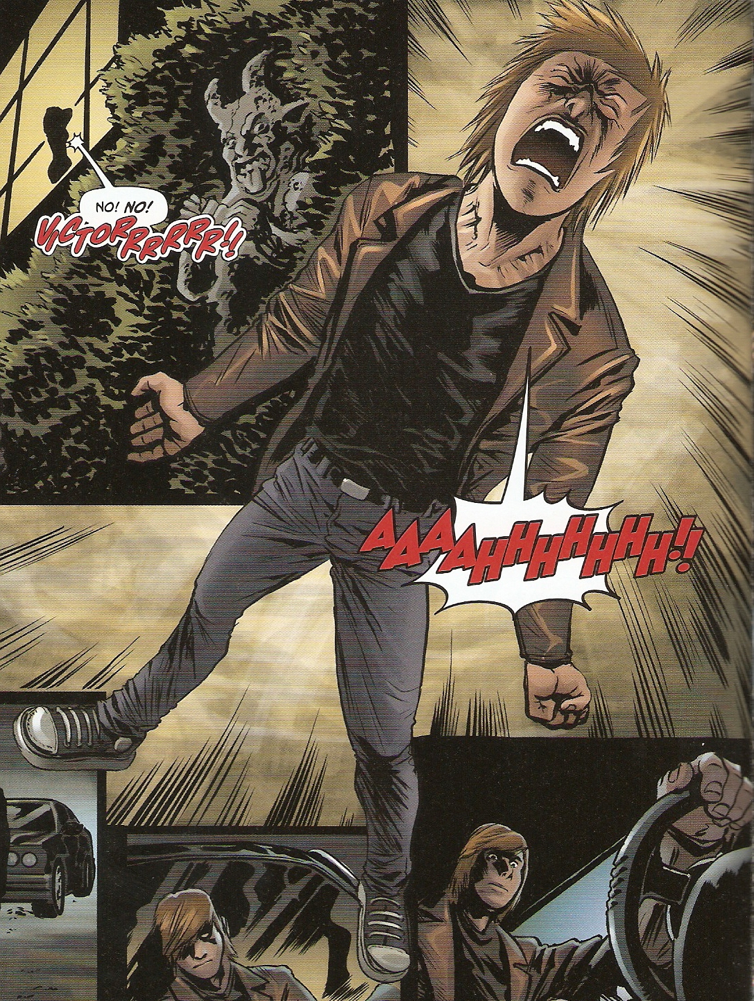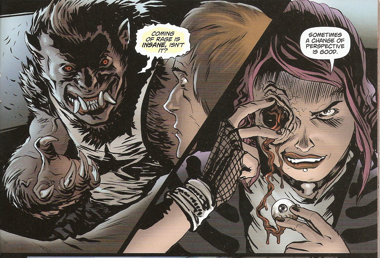 The fighting female tells him it was rage. Oscar goes into his lupine form. The roughed-up girl gives herself an extreme makeover: she removes her right eye :0 She is a zombie!!! Ritchie thinks it’s an elaborate practical joke. Oscar assures him that it’s real and that he’s just been initiated into the fraternity of freakdom. Ritchie will hone his ‘radar’ just like Oscar has. The lady’s name is Lilly. Here’s to the new Three Amigos!! Ritchie states his name and the fact that he’s a recent runaway.