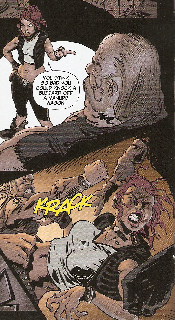 A white chick walks in looking for a fight. She gets her wish when she insults one of the muscle-bound boozers. The misogynistic hick clocks her one. It’s on!! Oscar rushes to her defense. The three youths become fast friends as they unite against the entire clientèle!! Fists fly in whirlwind motion.