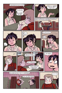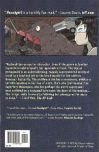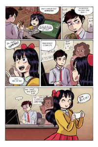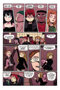 Ms. Gudsnuk’s art is a cross between Bryan Lee O’Malley’s style and Jeff Lemire’s. The latter creator is known for serious stories whereas the former focuses on humour. It permeates here. Parody is primo in this work. Mary Posa is no bumbling idiot but the notion of super-heroics and/or super-villainy is ludicrous!! The outrageousness is depicted in the facial expressions, twisted body renditions, and the situations.