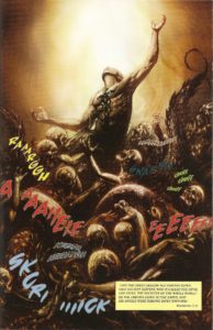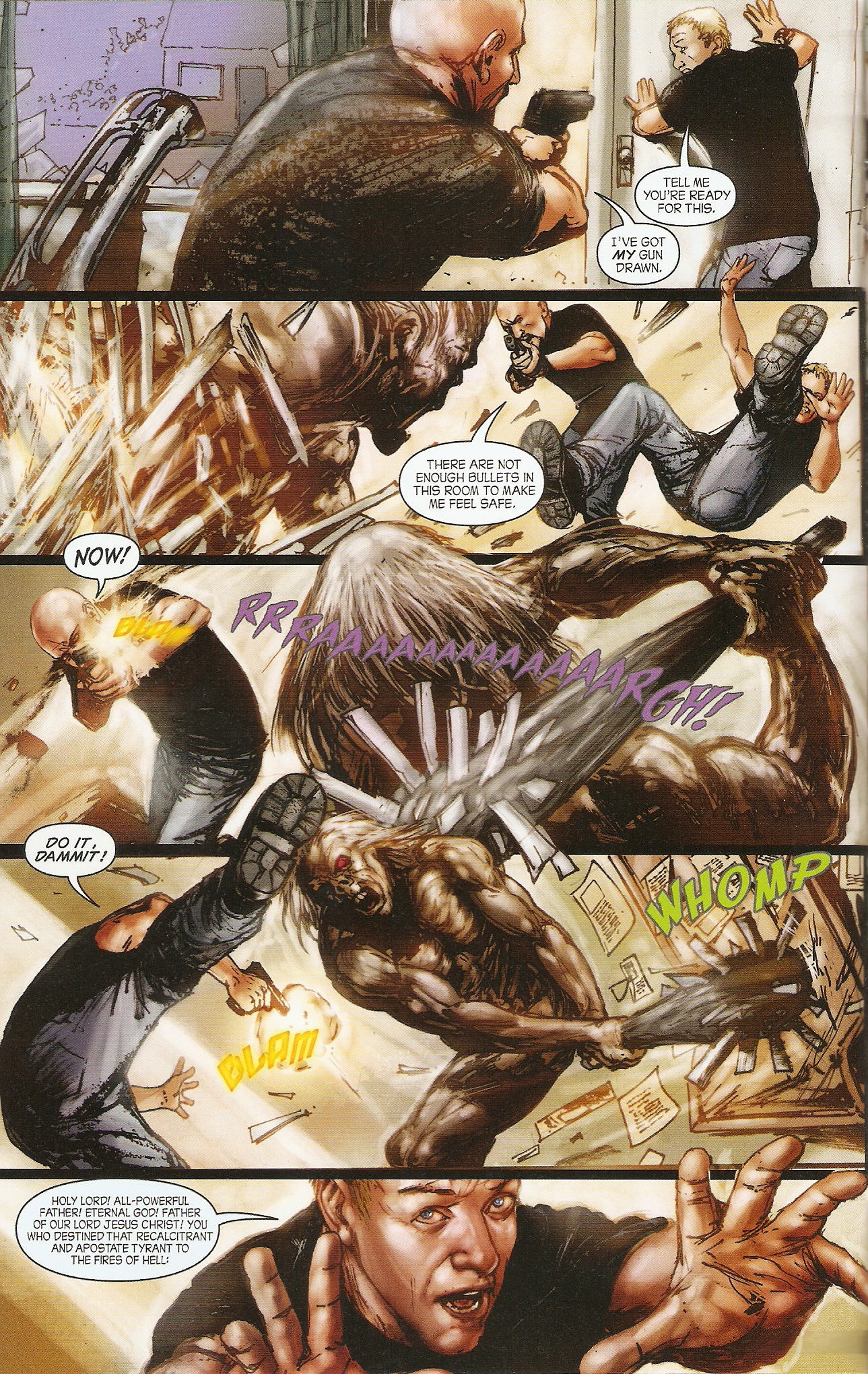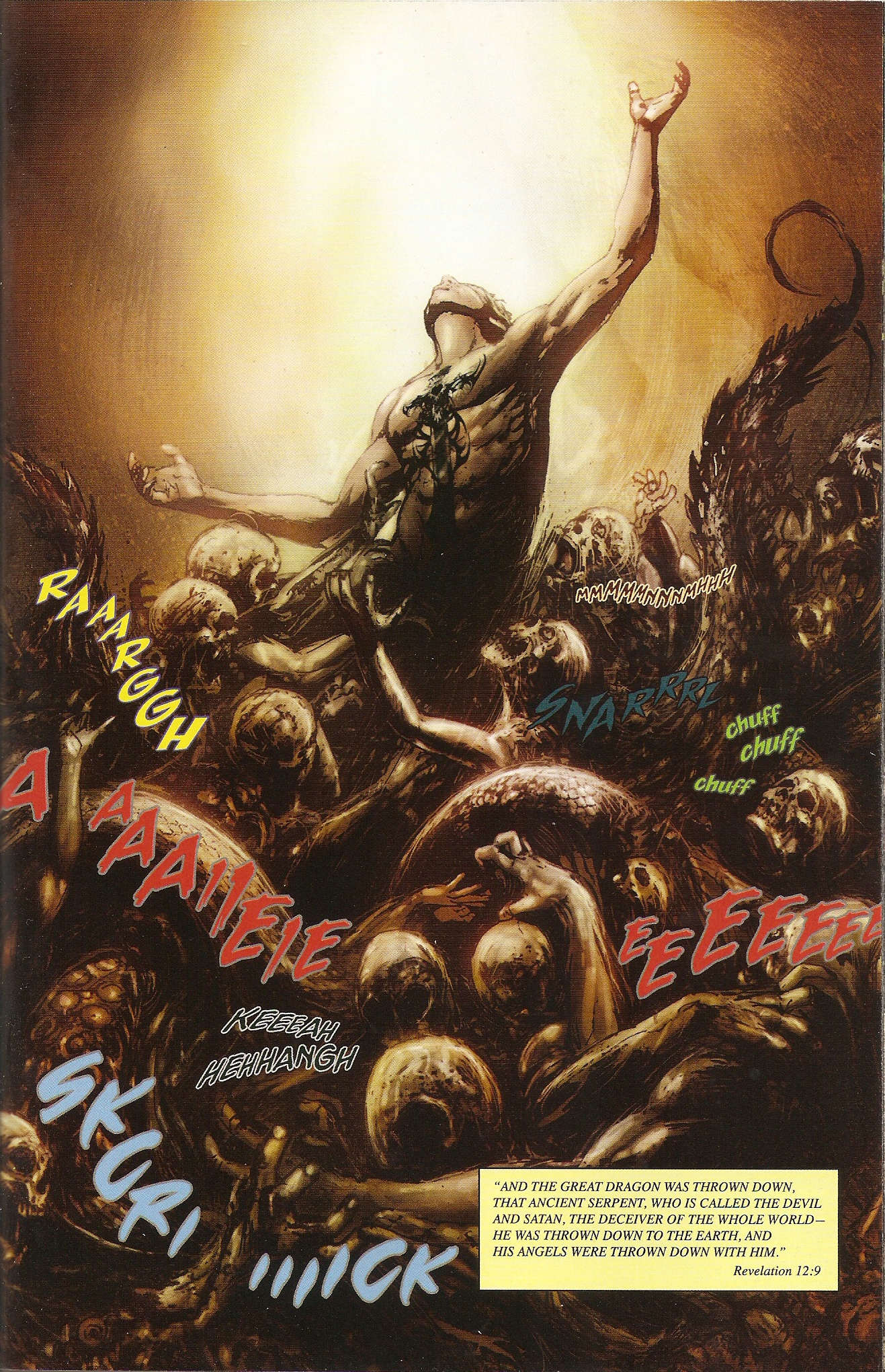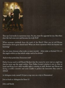 The first page has a passage from the book of Revelations chapter 12 verse 9. Essentially, it affirms the defeat of Satan and his minions. The page permeates with an image of Father Daniel Beckett raising his arms towards Heaven as corpses screech and scurry.