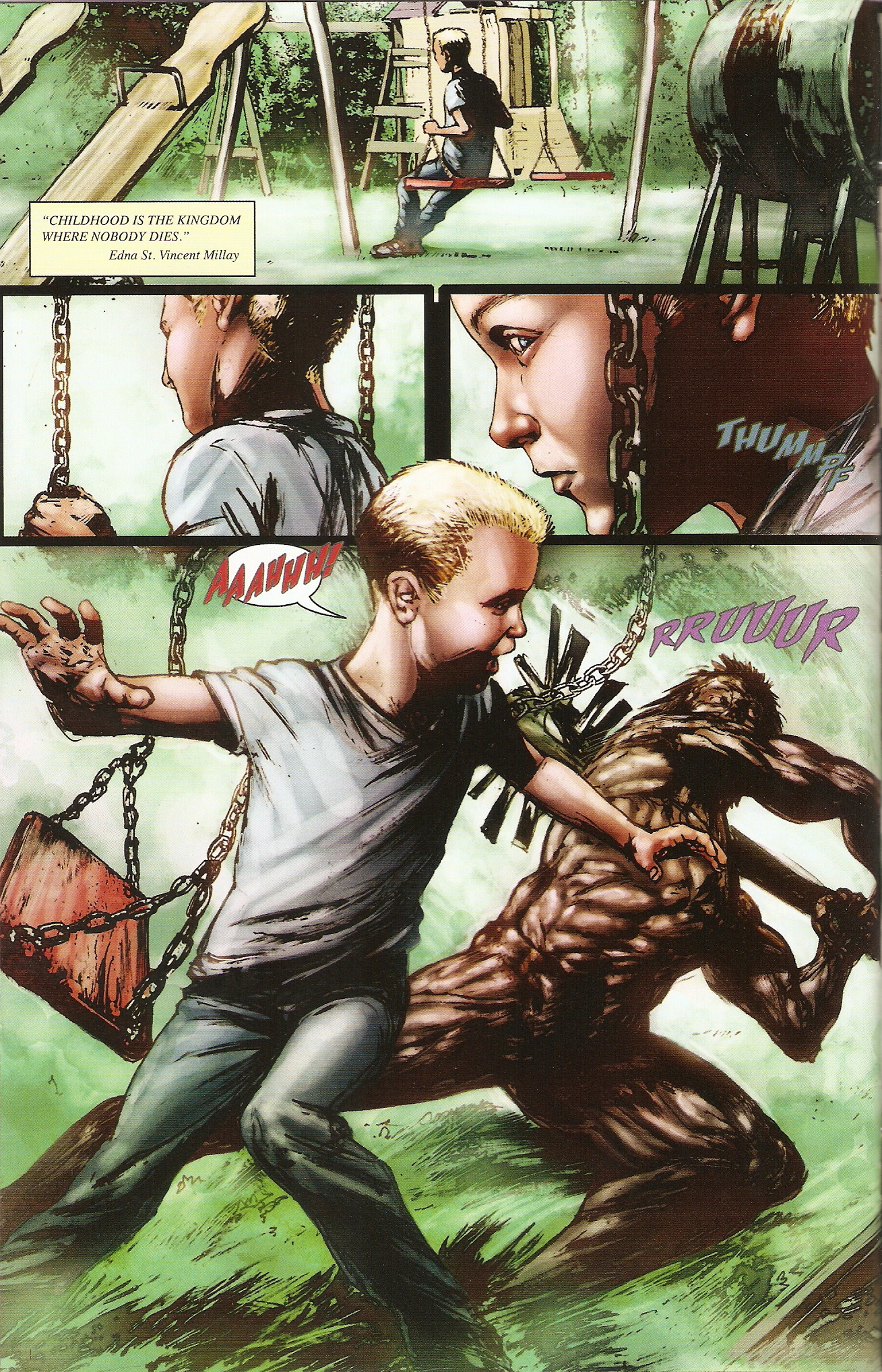 It will be at Ethan and Grant’s home. [Note: I will interject here. This is my first time reading this title. I naturally researched. This is the second part of a mini(?)/multi(?)-story arc.] Grant will be used as bait since he realizes the adults need his help in flushing out the demon-spawn. Could that be his brother Ethan that disappeared? Is Grant immortal? The trap is set. Grant is sitting on a swing in the backyard when the clubbed crazy makes his move. The Sheriff is agog, finally seeing the abomination with his own eyes.
