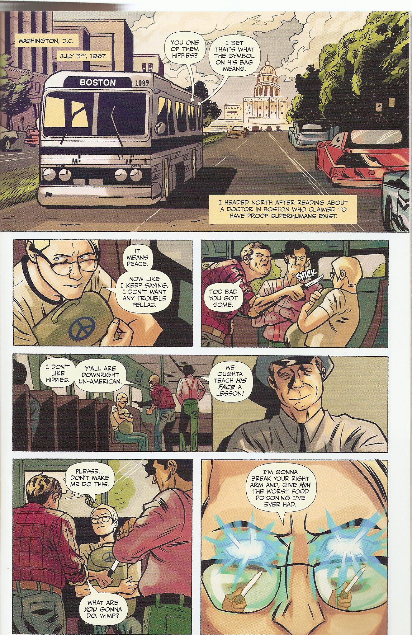 Sheepish [HAH! just realized that!] Banning James wants nothing to do with protests and rallies. He’s on a bus en route to Boston. He’s hell-bent on seeing a specialist that can diagnose and treat his unique condition: he’s a potent telepath!! This qualifies him as a super-human. Not even an ordinary bus ride grants him solitude. Two rubes threaten to rough him up simply because of the peace symbol on his backpack. Banning puts his mojo to work and is kicked out as a result of using self-defense.
