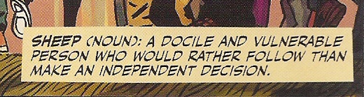 JUST ANOTHER SHEEP #1 power upJUST ANOTHER SHEEP #1 head shotsOED new entry: ‘sheeple’ has been part of modern-day lingo for the last few years. Clever portmanteau. It’s emphasized enough in the title, the bottom of page 5, and a poem composed by the protagonist.