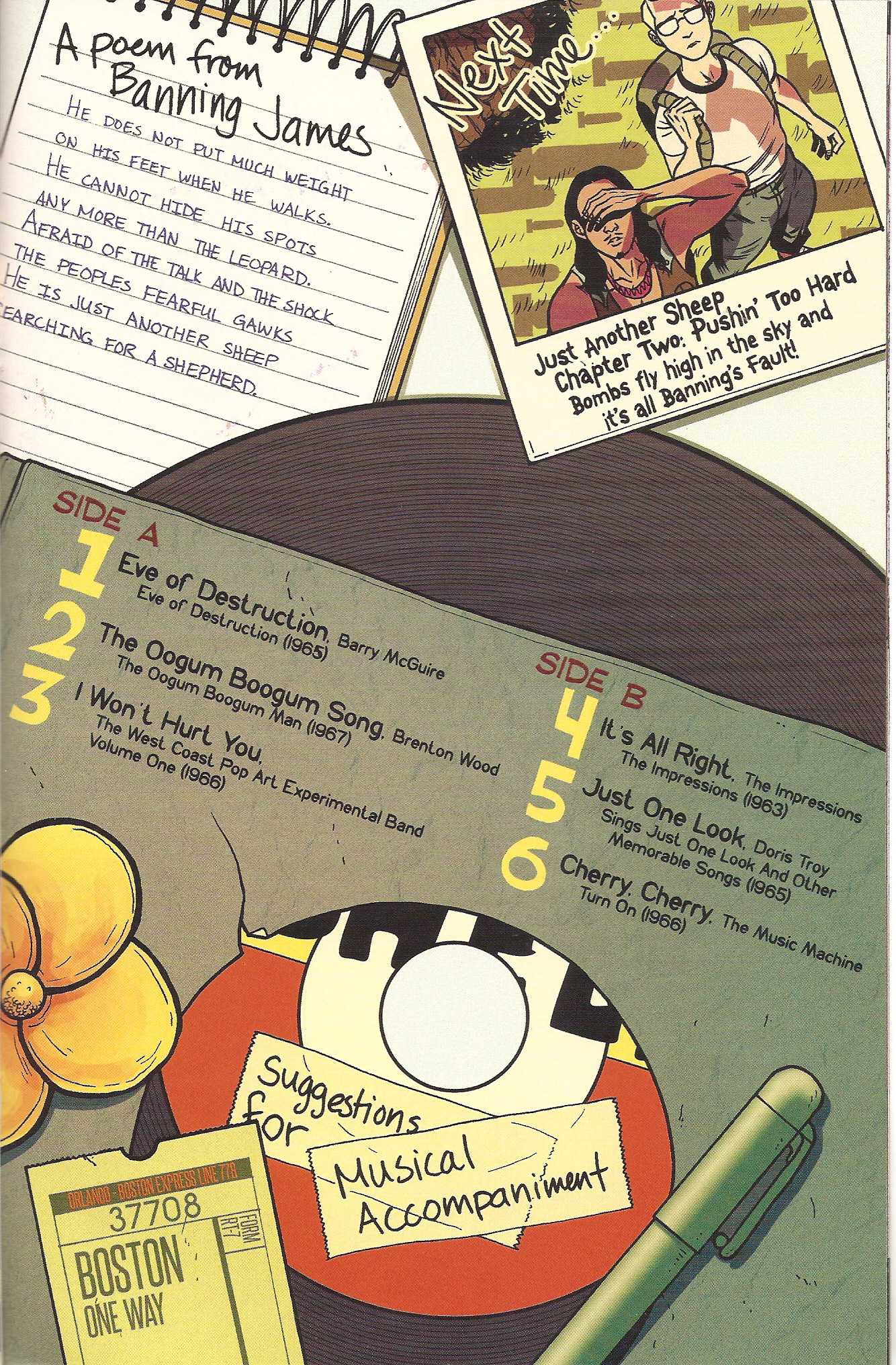 JUST ANOTHER SHEEP #1 bus ride from hellJUST ANOTHER SHEEP #1 who's sorry nowBanning is dropped off right in front of a group of vocal opponents. He barely has time to process his situation when a springly red-head named Sadie engages him in conversation. In four sentences, she’s able to put a smile on his face promising him a ride and bringing him into the fray. One more sheep added to the flock.