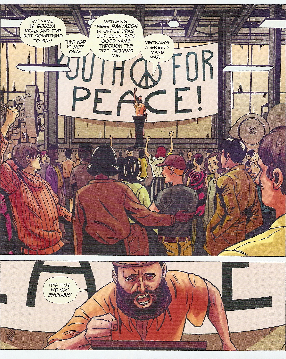 JUST ANOTHER SHEEP #1 trippyThe newly formed quartet stumble across charismatic speaker Soulya Kraj. He has a major beef with LBJ over the U.S. troops in Vietnam. There’s no more effective way than to storm the White House on America’s most significant holiday. Soulya may have spoken to the peeps but his intentions aren’t entirely pure. He needs cannon fodder for what he’s plotting.
