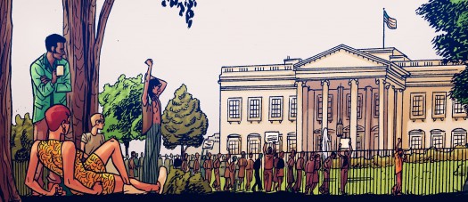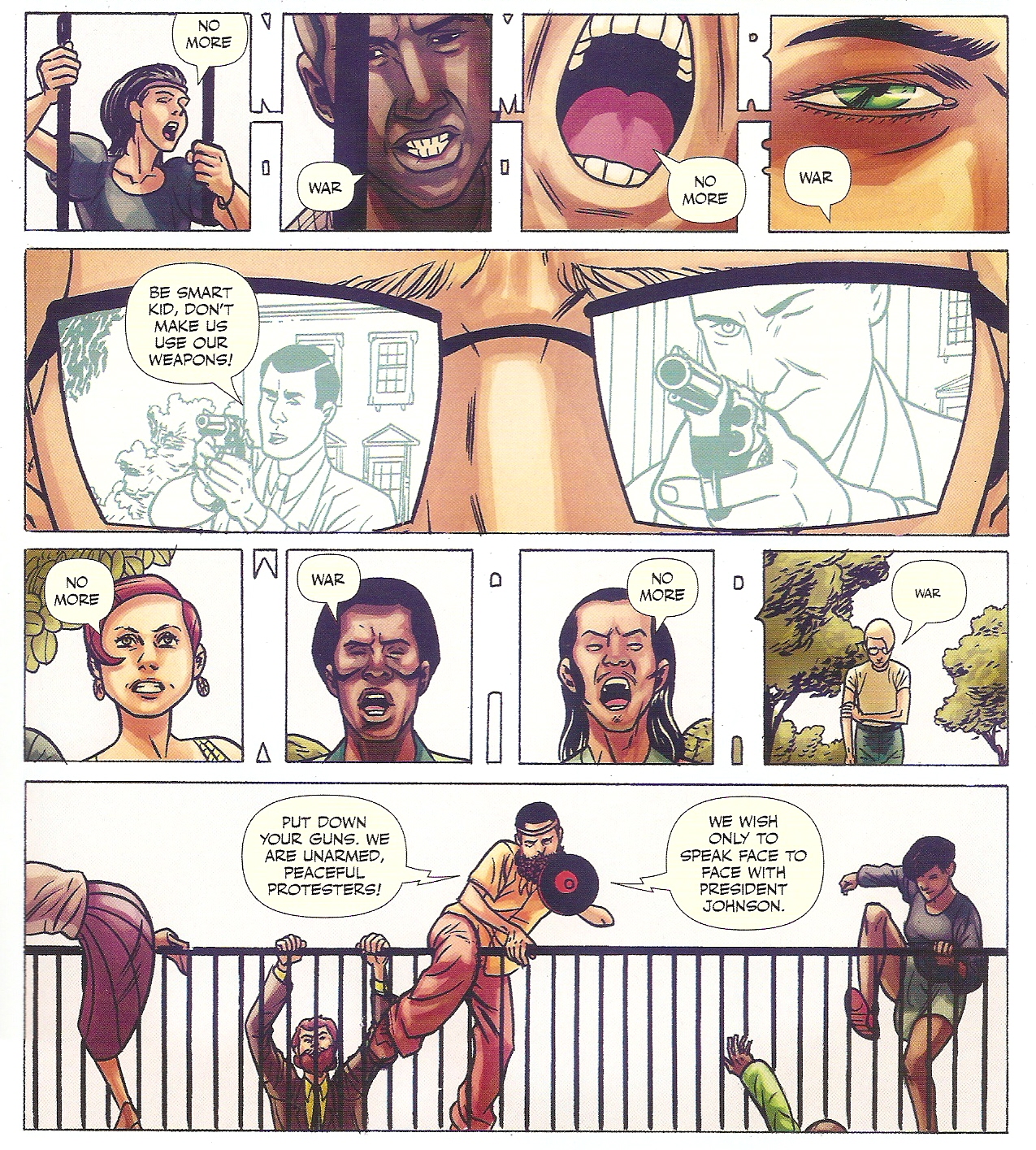 Action Lab logoSpeaking of history, as already mentioned, we take a trip through time to the Swinging 60’s. I find that term to be erroneous. Ironically, the peace movement had more than its share of hiccups, bruises, scrapes, and falls. There is a real world connection with the mention of the 36th POTUS. The chronology of events is a few years off but it’s all good. Mellow out, man! There was a march on the Pentagon Oct. 21, 1967 and two prior to that event in 1965 and 1966. Two Moratorium movements to end the Vietnam War occurred in October and November 1969.