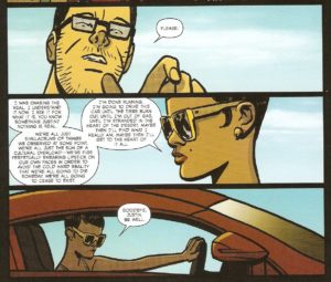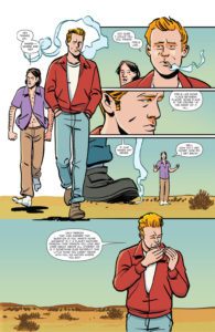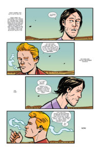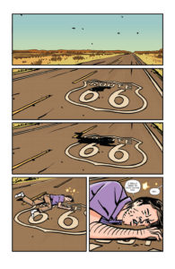 Colin Bell’s work experience is also diversified. I might as well cover all the bases. He has worked for BOOM!, Comixtribe, Dark Horse, Dogooder Comics, Martian Lit, and Unthank Comics. This man has his A-game on especially with the stylized “Glitter**** Empire” logo. The Courier font from the typewriter is extremely accurate. The Route 66 designation is a no-brainer. The dialogue and narration are more miniscule than usual but still legible.