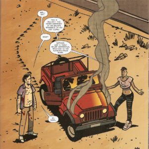 Chris Peterson started off with Arcana Studio, Challenger Comics, and monkeybrain Comics. Talk about six degrees of separation!! I’m horrible at reviewing art. I will attempt to acknowledge properly. It’s the little things that make me re-look at all the panels and pages: the tire tracks in the desert. The super-cool magnifying effect of the bench is an ingenious visual aide. I also smile at the basic lines depicting Terrance’s hirsuteness. Given my lack of artistic ability, I would do the exact same thing!