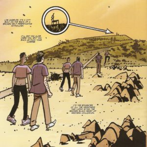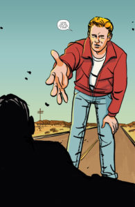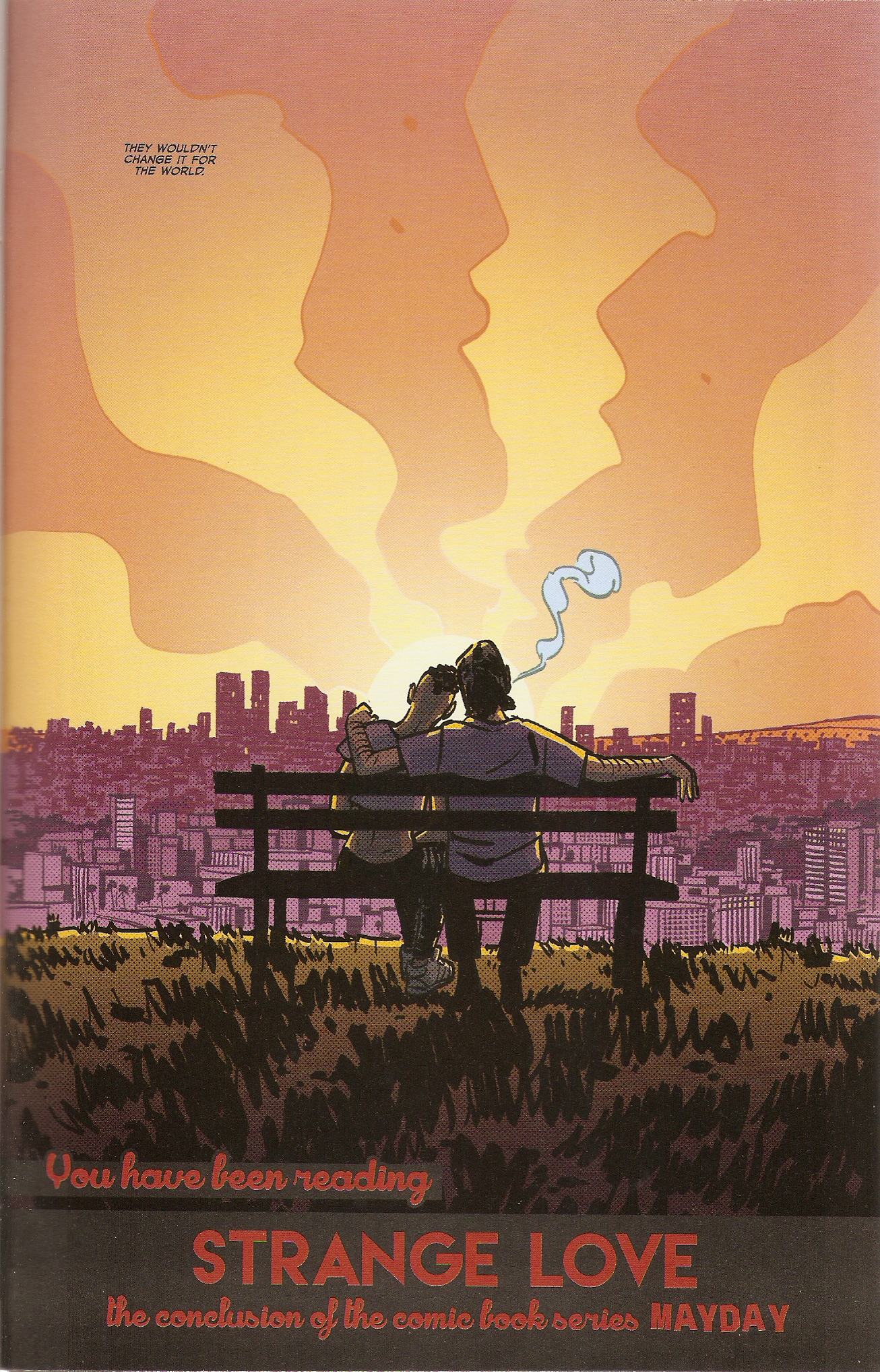 Morning, sunshine J James Dean implores Terrance to snap out of it and march right back up. Kloie says it a little more forcefully. Terry thinks he’s at the end of his rope. Kloie assures him that there is no real finality. He wants to express his regrets in being a total douche when he espies the landmark cultural icon atop Mount Lee!! Terry gives a brief description of the darkness in L.A. but he and his lovebug wouldn’t have it any other way. Credits indicate: “You have been reading STRANGE LOVE the conclusion of the comic book series MAYDAY.”