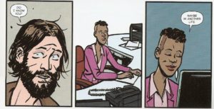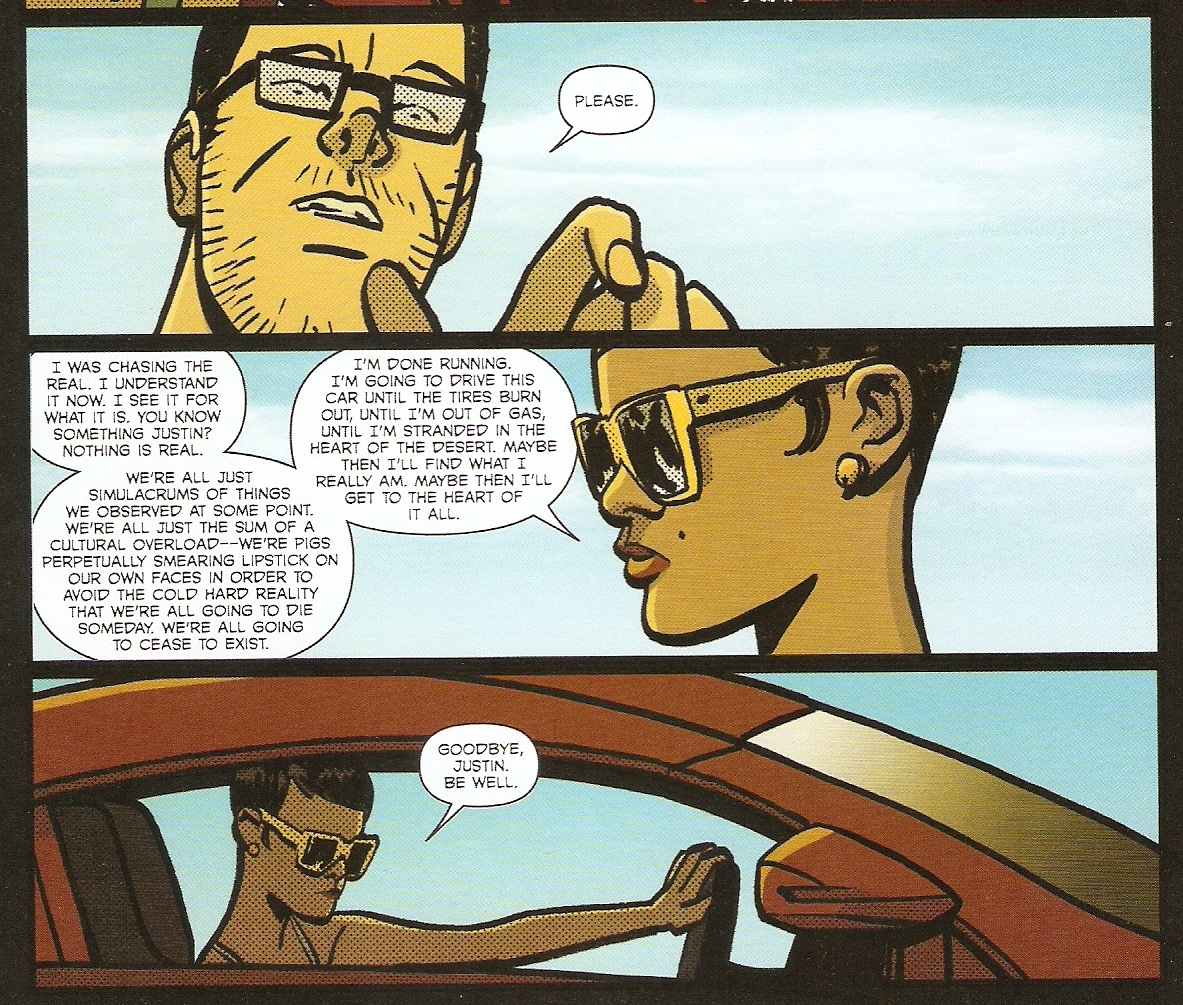 Hooray for Hollywood!! The Writer stands smoking a cigarette looking out a window. His life is falling apart but he has some optimism. The iconic giant letters are in the background. The typical tropes of sex, drugs, and disco play in three separate panels. The writer is also a filmmaker. He vividly recalls one dream in which he compiled the entire history of mankind on to a massive reel. This is very stream of consciousness since it isn’t supposed to make much sense. Snippets of random scenes are sparsed throughout. This man wants to replay, recut, remake the scenes from his own life but it’s impossible. He tries to convince his lead Anastasia to stay. His name is Justin. She gets real deep and cuts up the illusion of fame and fortune. Justin comes to term with the emptiness of his existence. Sartre, anyone?? Fade to black. Credits indicate “Directed by Terrance Gattica”.