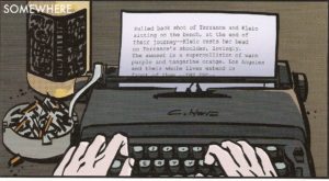 Terry, the writer, has just completed typing the last page of his new movie. The paragraph is an exact description of the previous panel on the previous page.