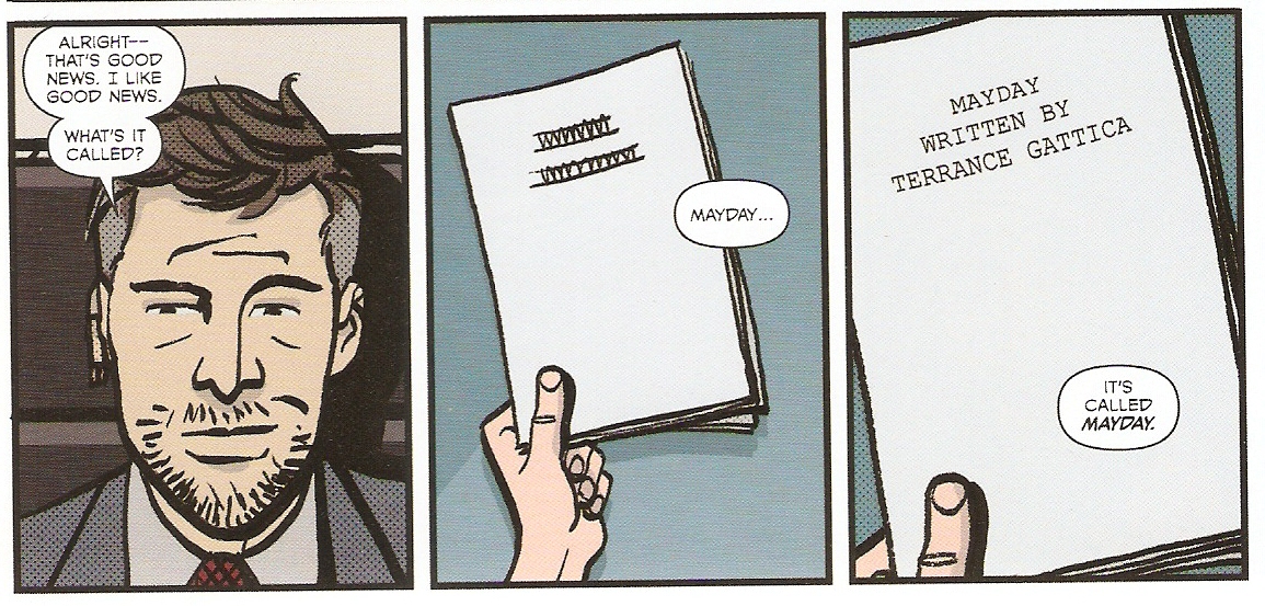 BMS deals with movies in this reality and Mr. Pizzolo is the bigwig. Terry barges in. Matt asks if he is inebriated. Just a tad. He drops the script. It’s called MAYDAY. Done, son!!