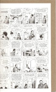 The simple black and white renditions in the tightly structured twenty panels make the strip serial in nature. Were this a daily read, one could easily catch up on the five installments. Interestingly enough, the most number of panels focus on Mr. Tomine’s principles despite the disbelief of his friend/colleague/acquaintance. An equal amount of time is given to the missed movie pitch and his home life. Fame is so fleeting that the deal is gone and most certainly forgotten before it even took flight. The hectic nature of young families is presented dead-on. Responsibilities never end. Chores must be done. Bills pile up.