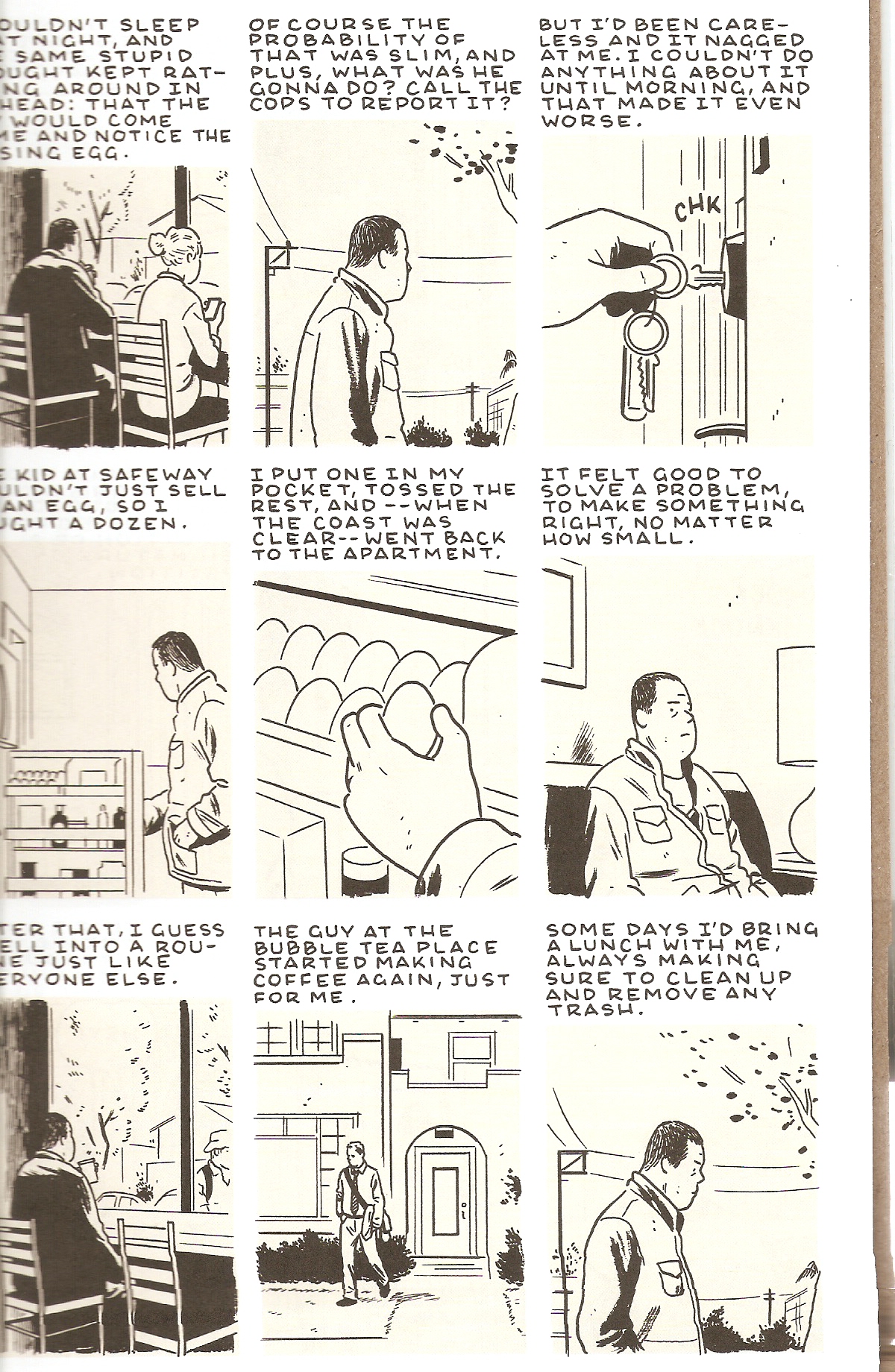 I still find it hard to critique art. I have below zero talent in that field. Luckily, I also research before and after. All I can say is that Mr. Tomine has clean line work. I find the mostly twenty panels per page visually engaging. The more details that can be crammed, the better. The elongated panels provide more exposure. The white space indicates pause and/or transition as shown on pages 17 and 26. The characters are indicative of the typical middle-class American family. No exaggerated attractiveness, just plain, unassuming individuals trying to make a mark in the world.