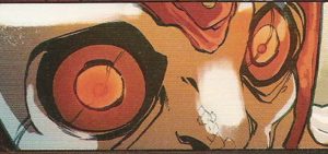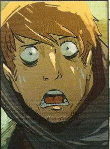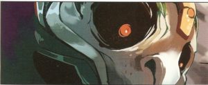 Djet Stéphane is heavily inspired by Japanese animation. The colours are the highlight: strong and bold in the foreground; lightly brushed in the background. The best depiction of the manga/animé aesthetic is Alan’s astounded expression when Jonas is snatched. Ayo is a formidable fighter. I’m a sucker for butt-kicking no-nonsense take-charge females. Despite just meeting her, she really grew on me. It’s most unfortunate she had to pass away. REM is an eerie elongated version of Death’s Head.