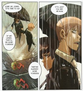 The two sibs put their feet on the ground and hit the road: they refuse to be wards of the system. Jonas has taken a step back – he can’t remember any previous dreams nor does he believe he’ll be able to ever again implying insomnia.