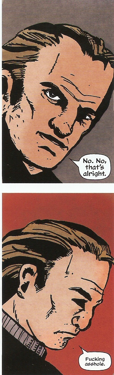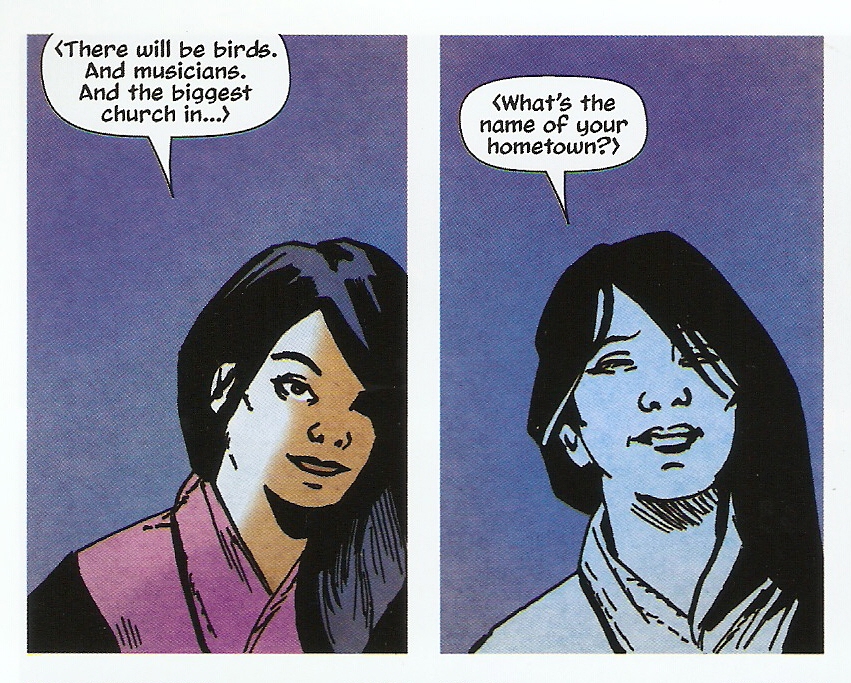 The art is standard in terms of the pencilling. The faces are given solid lines with thick shadows over the eyes indicating hardened lives for the cast presented. Every panel is awash in a particular colour: red, pink, grey, purple, green, blue. Each is reflective of mood, setting, and character development. The softer colours are warm and visually comforting; the darker colours alternate between serenity and seriousness.