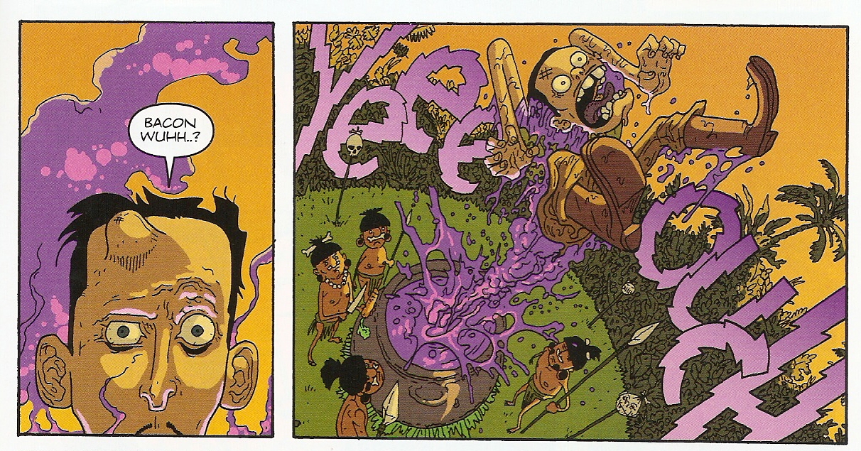 Luigi Anderson’s techniques diversify. I noticed the black borders for the caveman’s innovation, the ape’s ingestion, and Nate’s trip [pun intended!] to the script doctor. I am not going to point out the use. I will say that it’s a welcome break from the traditional white. The colour green highlights the dire strait that Stan is in when he fails to stay buoyant. Mr. Anderson also utilizes ‘hair light’ whilst Nate partakes in the potion. Gradient fill paints the most beautiful skyscape and demonstrates Nate’s entry into an altered state.