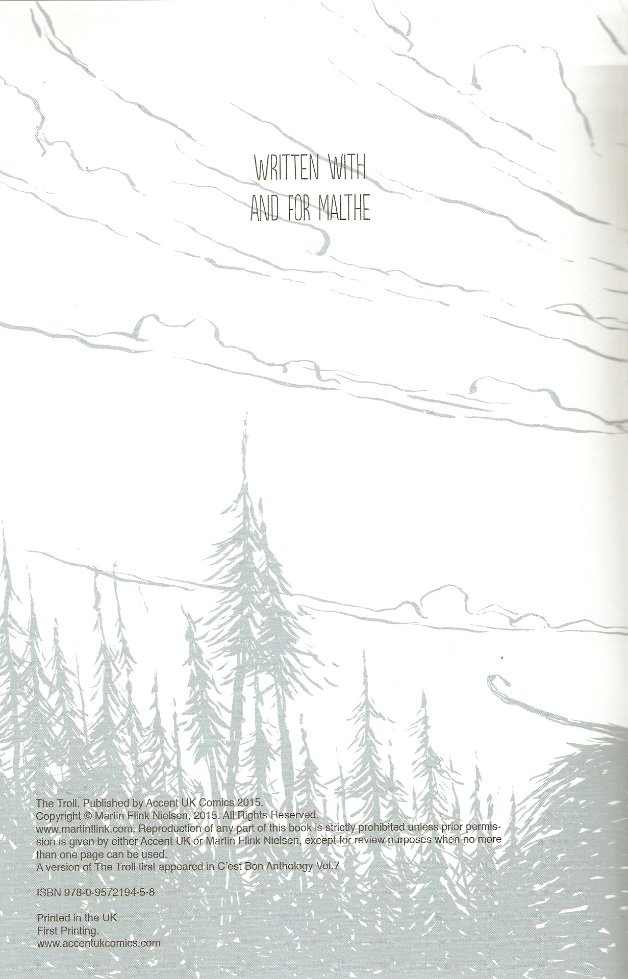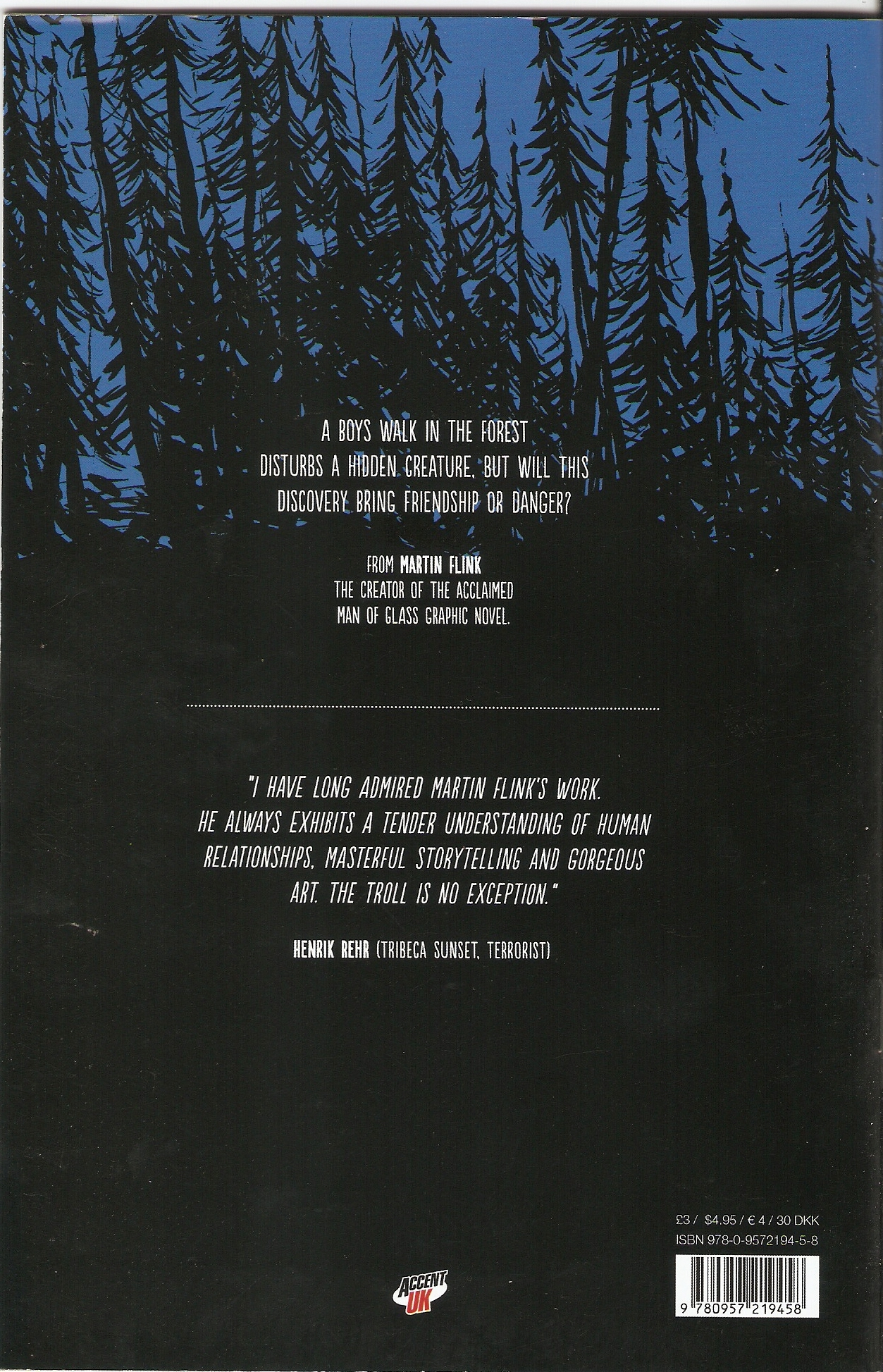 I’m mildly curious by the ‘a version’ remark in the indicia. What changes were made? I wish I could easily procure the first draft. Mr. Flink’s eponymous webpage states that he self-published his small body of work until 2010 when Accent UK accepted The MAN of GLASS. This re-telling re-emerges six years later. Luckily, I found two links for reviews from Accent UK’s site. Broken Frontier credits Down the Tubes with the inspiration behind this sublime oeuvre: Mr. Flink heard a recounting of his young son’s sojourn through sylvan.
