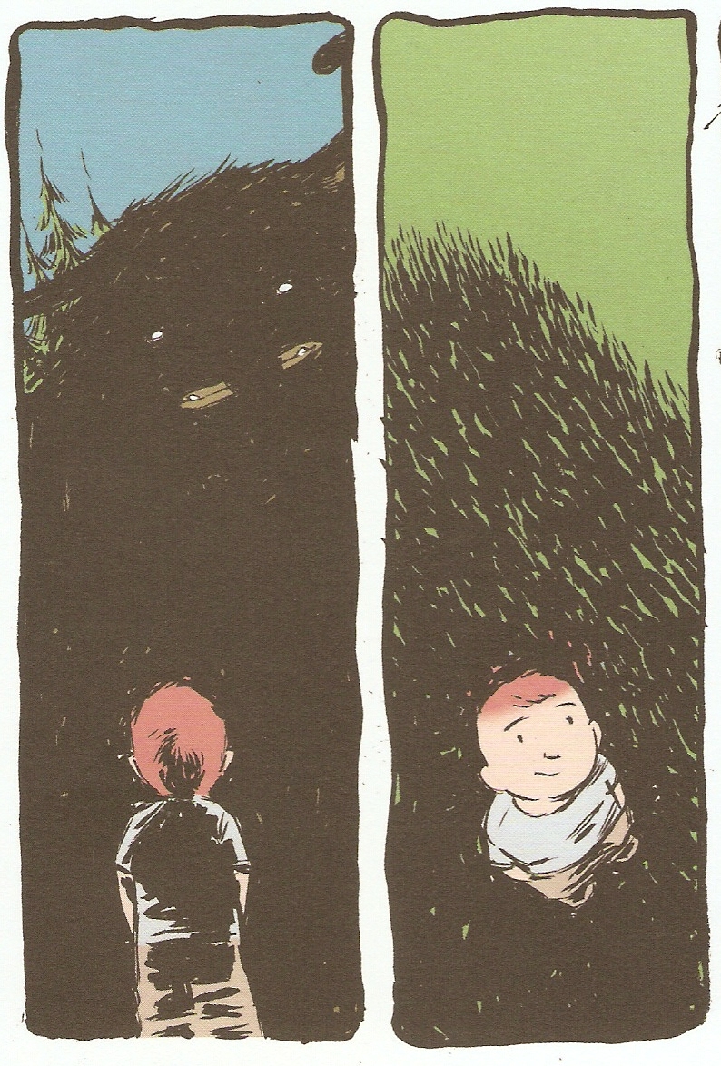 A black behemoth envelops the boy’s line of sight seeming to cover the entire opening. The most natural reaction: run for his life! The trope is that the panic sets in and the rambunctious red-head trips over a branch and falls. This monstrosity is a gentle giant times three. He scoops the tot, puts him on his shoulder and gives him the most glorious view of the forest.