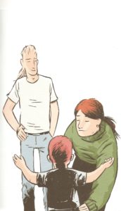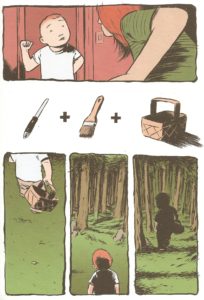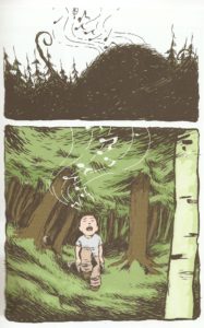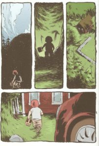 Mr. Flink provides two different angle shots – the tilt on page one showing the boy’s elation; the lengthy lanky trees circling the boy without a peek-hole on page four. The paneling is standard but somewhat unique in that the solid lines are replaced with squiggles.