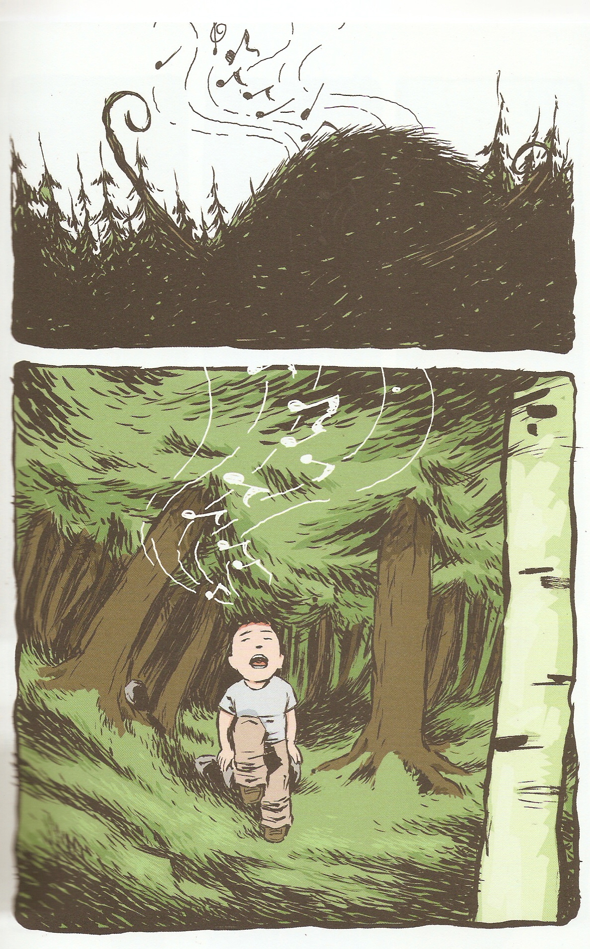 The unlikely pair are now friends. A reassuring smile from the Troll is returned in kind. To solidify the bond and express contentment, he bolts out a tune. The boy responds accordingly. The hill is alive with the sound of music >_<