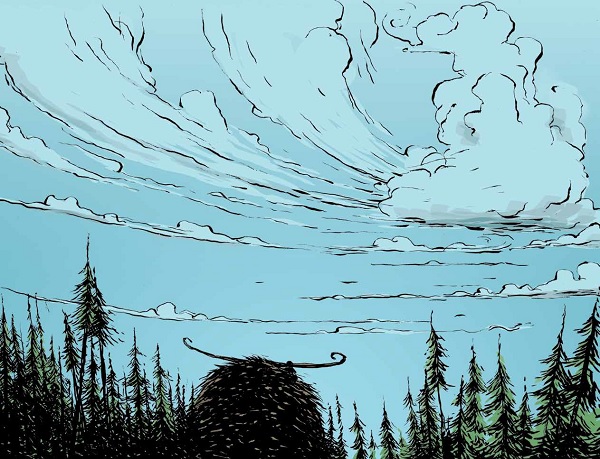 There are five full pages. Together, they tell their own story leaving obvious gaps. The double-page spread near the end illustrate the immensity and awe of the outdoors. As ginormous as the Troll is, even he can’t touch the sky. The pale blue emits peace and serenity associated with the yonder.