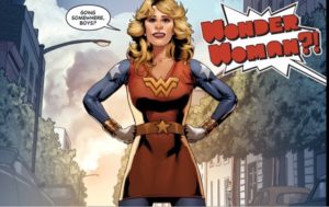 Re-enter CLC WW. She addresses Diana as Ms. Troy [that’s Donna, the ‘real’ Wonder Girl for all your hardcore fans!] CLC tries to calm her and urge her to return to the hospital and retake meds. Diana doesn’t fall for it. In fact, she fells CLC with a swift drop kick!! She holds her own extremely well despite her civilian guise. A welcome interruption is made by Steve Trevor who throws a beer bottle at the aggressive blonde. He is a bum/wino!! A mailbox knocks him out.