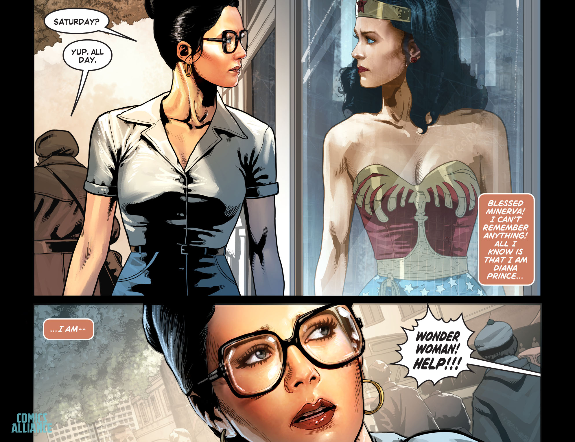 Diana Prince awakens dazed and confused on the street. A police officer helps her to her feet. Diana asks an elderly passerby the day of the week. The woman tells her “Saturday” and suspects Diana was partying hard. As Ms. Prince walks past a storefront window, she sees a reflection of her true, heroic self. Suddenly, a cry for help is uttered specifically directed at Wonder Woman.