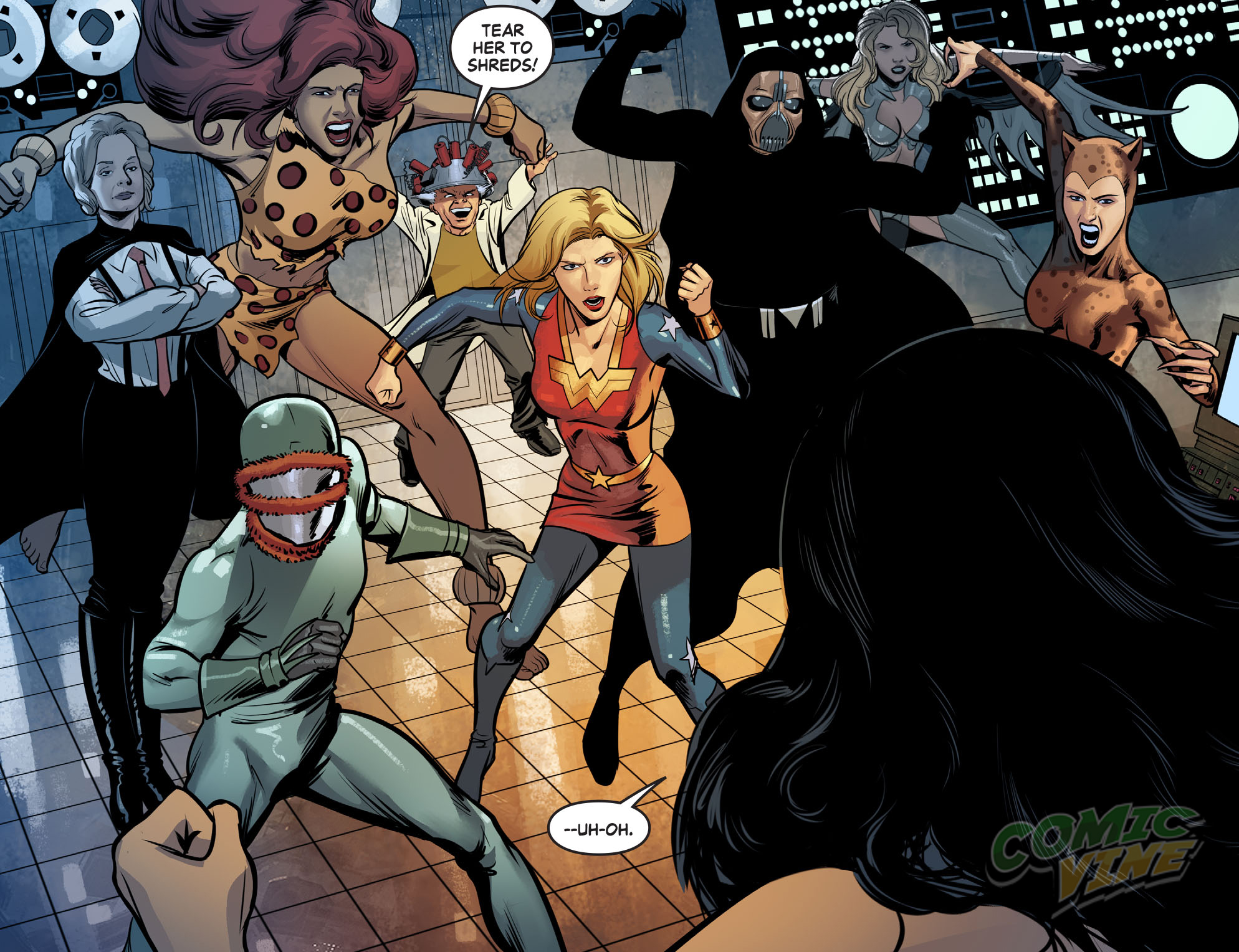 Diana takes off her specs and gets ready to rumble. The imposter doesn’t give up easily. As she shoves Diana into a car, the costume is seen through the torn clothes. With a determined spin, the real deal emerges. When CLC is tied up with the magic lasso and asked to reveal her identity, a mirror shatters showing WW strapped in a lab. The culprit is astounded and annoyed that his quarry has broken free. It is none other than Dr. Psycho!